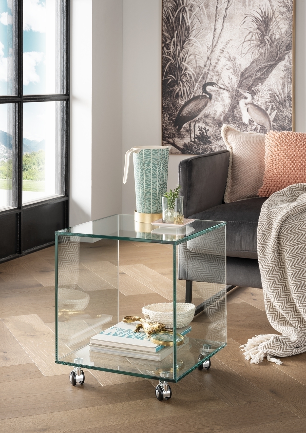 Moderner Glas-Beistelltisch mit praktischen Ablagen und Rollen