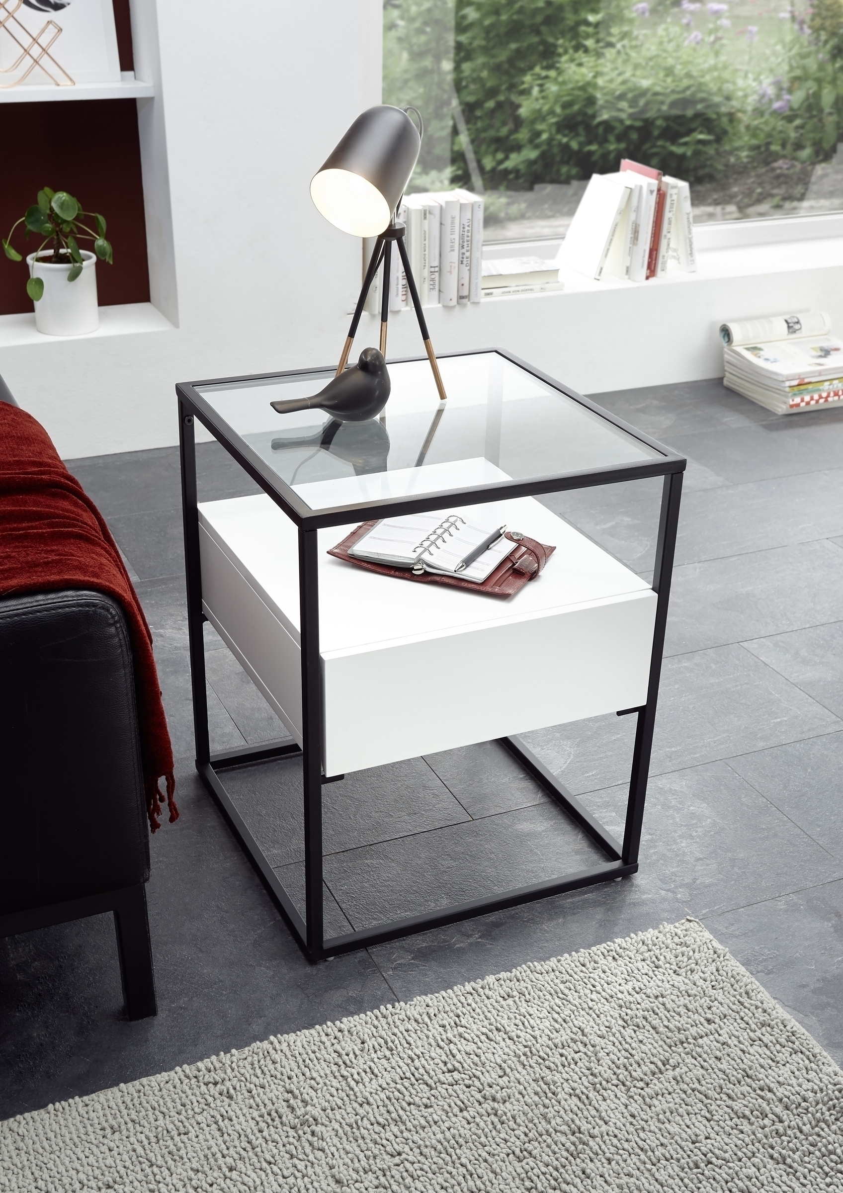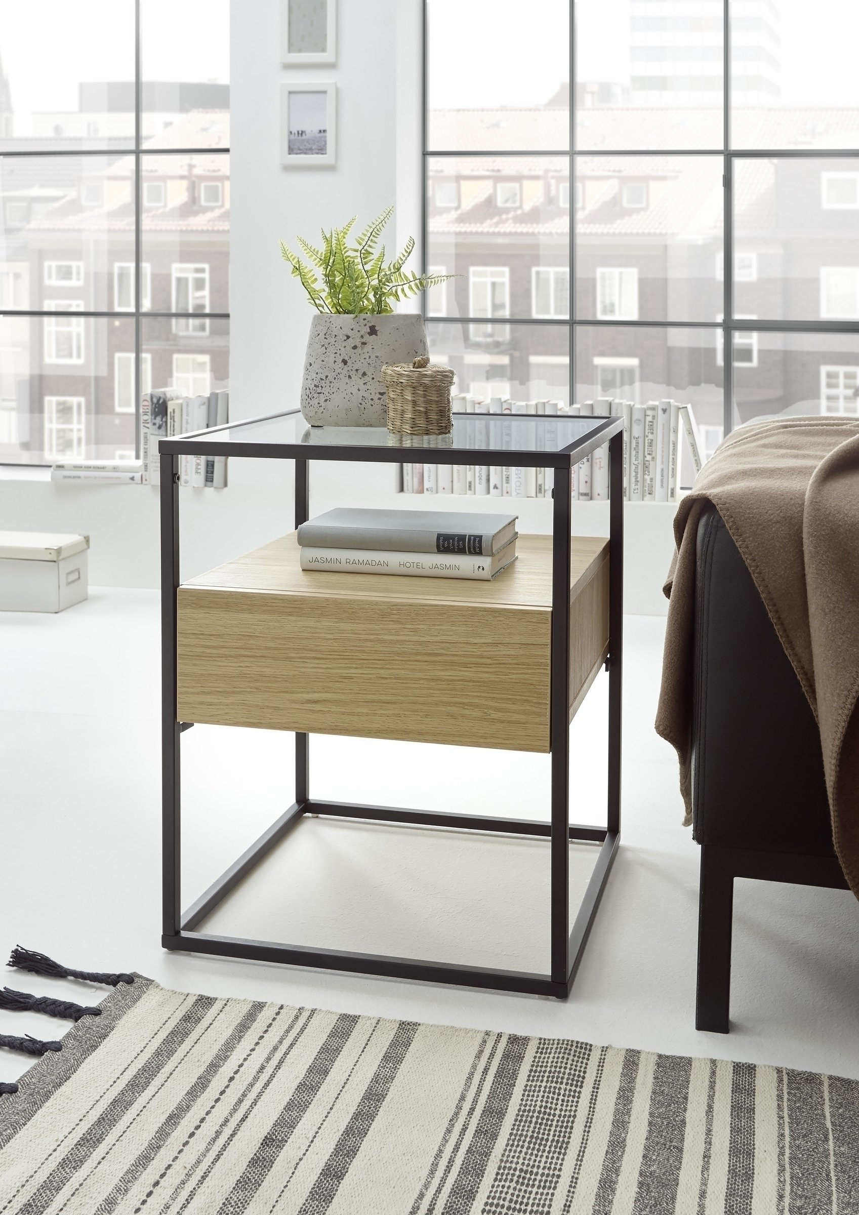 Funktional punktet der Beistelltisch mit einer clever integrierten Schublade. Sie verschwindet optisch im Korpus und bietet dennoch ausreichend Platz für kleinere Utensilien, die im Alltag schnell zur Hand sein sollen, ohne offen herumzuliegen. So bleibt die Glasoberfläche frei für Dekoration, eine Tischleuchte oder das abendliche Getränk, während Kabel, Notizbuch oder Fernbedienung ordentlich verstaut sind.