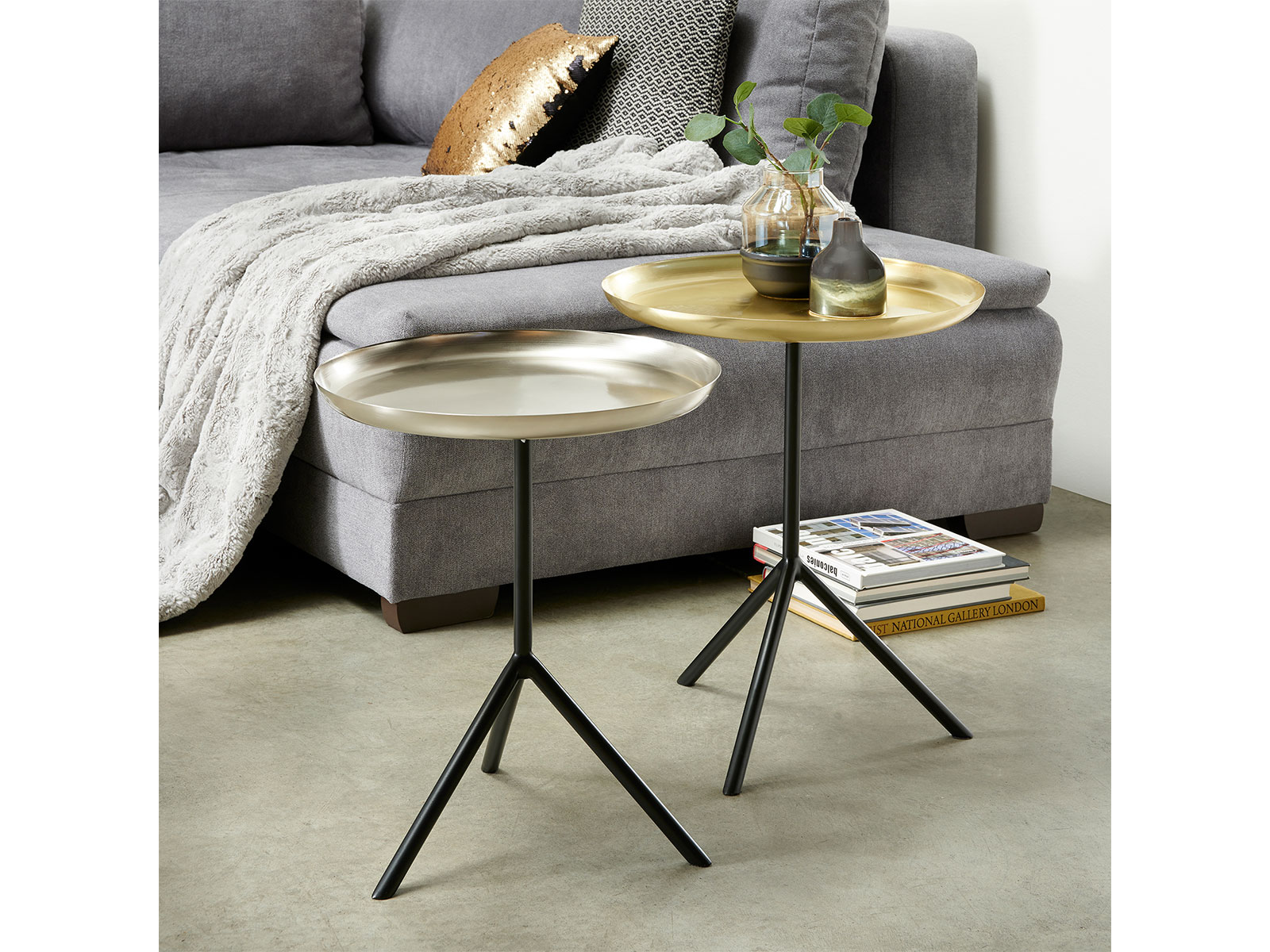 Die Tischplatten in edler Messing-Optik beim größeren und glänzender Silber-Optik beim kleineren Tisch bilden zusammen mit dem schwarz lackierten Metallgestell eine elegante Kombination, die Ihrer Wohnatmosphäre einen glamourösen Touch verleiht – ob neben dem Sofa, als Nachttisch oder als kleiner Couchtisch.
