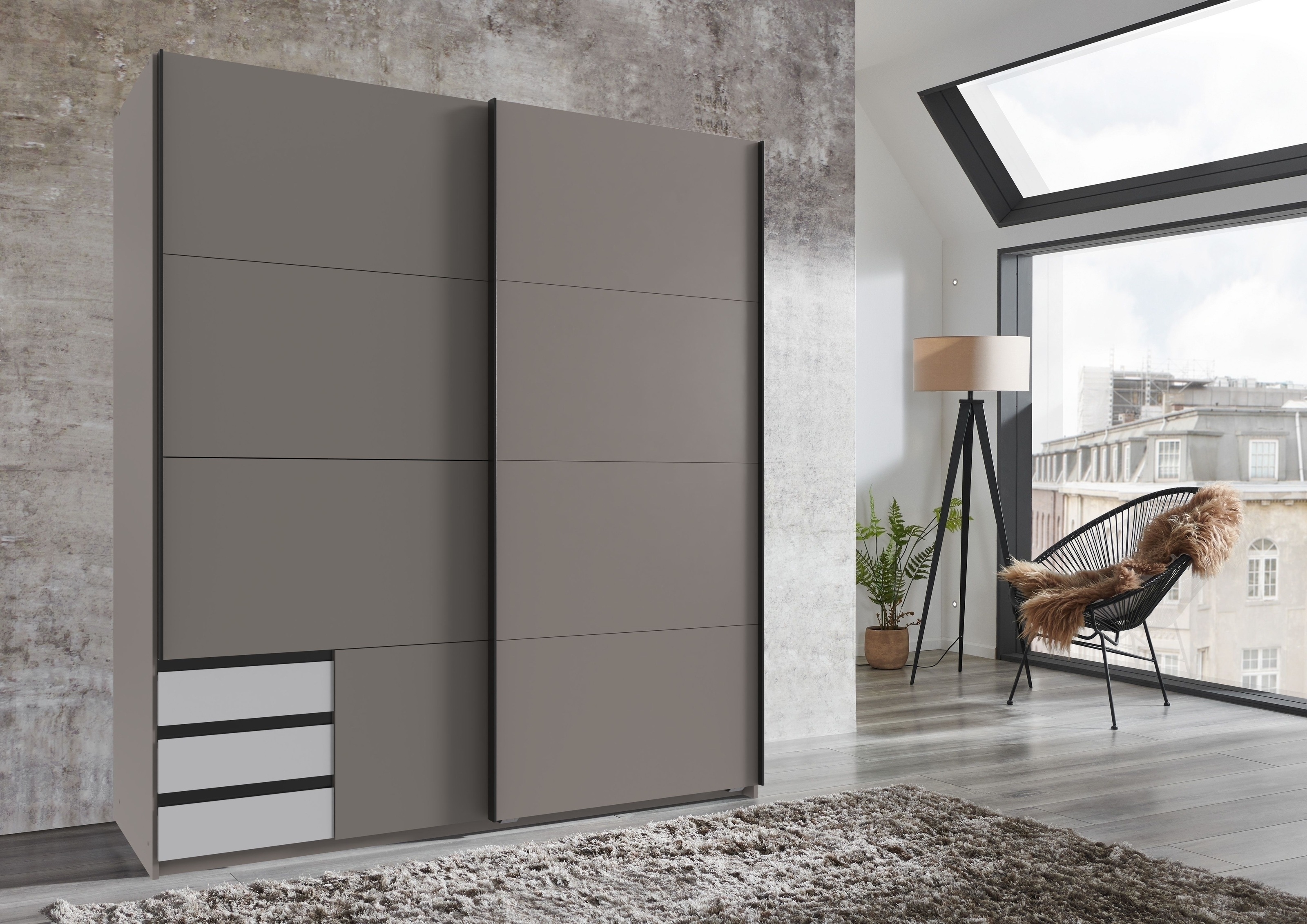 Der saharagraue Korpus bildet eine ruhige Basis, während grafitfarbene Elemente dem Design eine markante, zugleich elegante Note verleihen. Die klare Linienführung unterstreicht den modernen Wohnstil und sorgt für eine strukturierte, aufgeräumte Optik im Raum.
