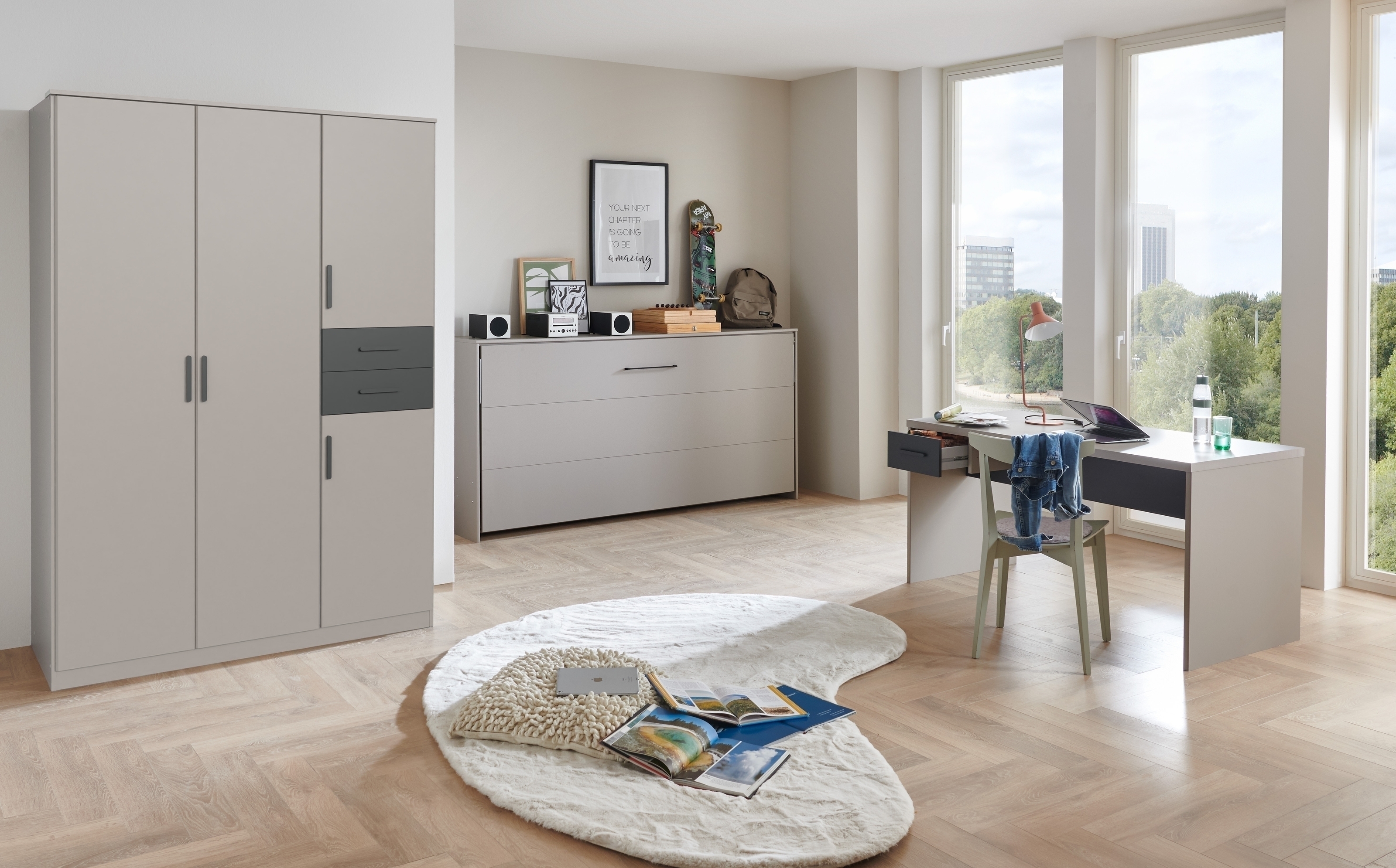 [cWert] => Modernes Design in SAHARAGRAU + WEISS mit Griffen in GRAFIT – stilvolle Optik passend zu zeitgemäßen Jugendzimmer Möbeln.
