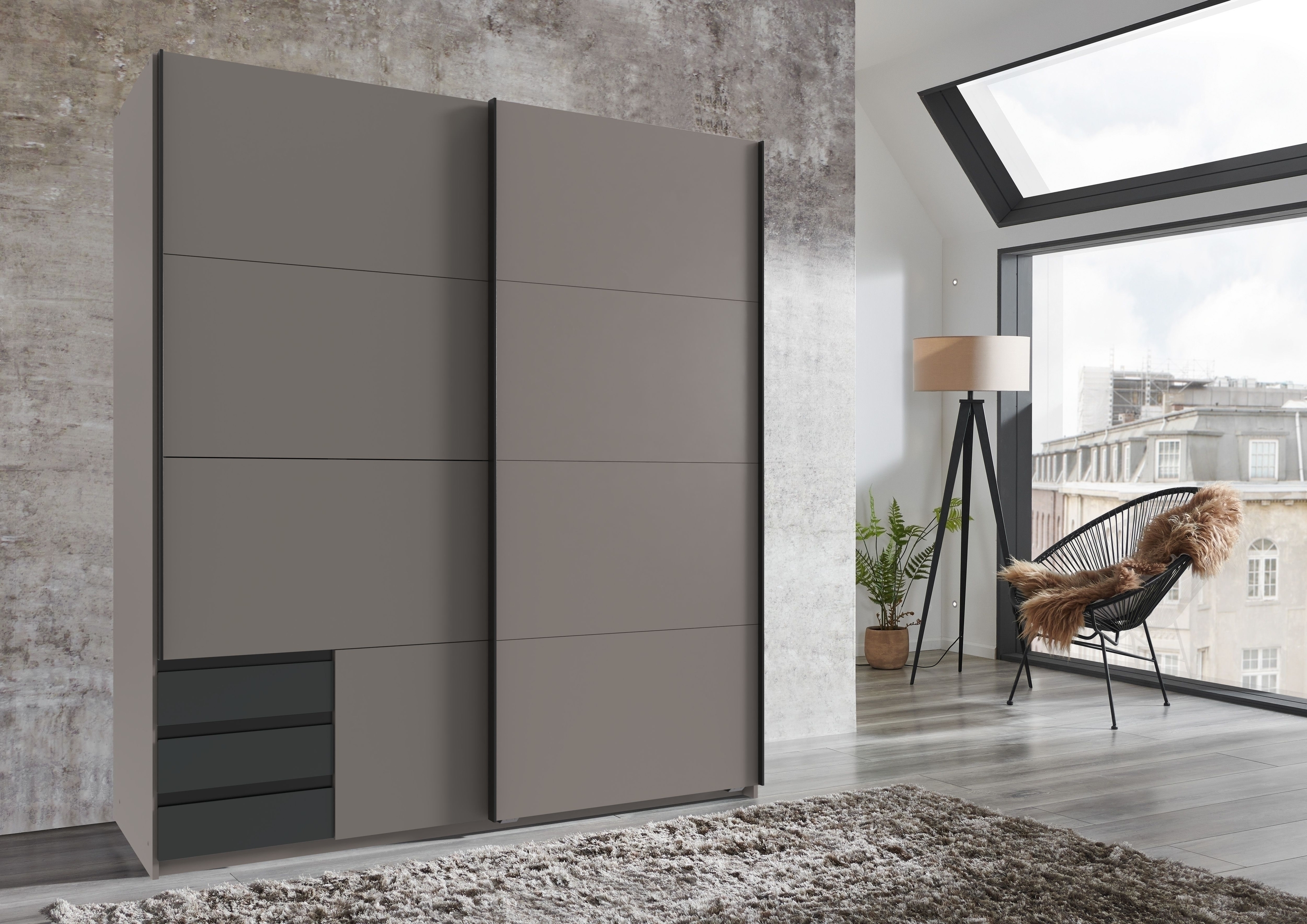 [BulletPoints] => Maße ca. 179/198/65 cm (B/H/T) – großzügiger Schwebetürenschrank mit 2 Türen, 3 Schubladen und viel Stauraum für moderne Kinder- und Jugendzimmer.;Modernes Design in SAHARAGRAU + WEISS mit Griffen in GRAFIT – stilvolle Optik passend zu zeitgemäßen Jugendzimmer Möbeln.;2 Einlegeböden (je ca. 87 cm) und 2 Kleiderstangen (je ca. 87 cm Länge) – flexible Aufbewahrung für Kleidung und Accessoires.;Robuste Holzwerkstoff-Spanplatte – pflegeleichtes, langlebiges Material ideal für den täglichen Einsatz im Jugend- und Kinderzimmer.;Lieferung in 6 Paketen, Gewicht ca. 143,5 kg, zerlegt zur Selbstmontage – inklusive Anleitung, ohne Inhalt und Dekoration.