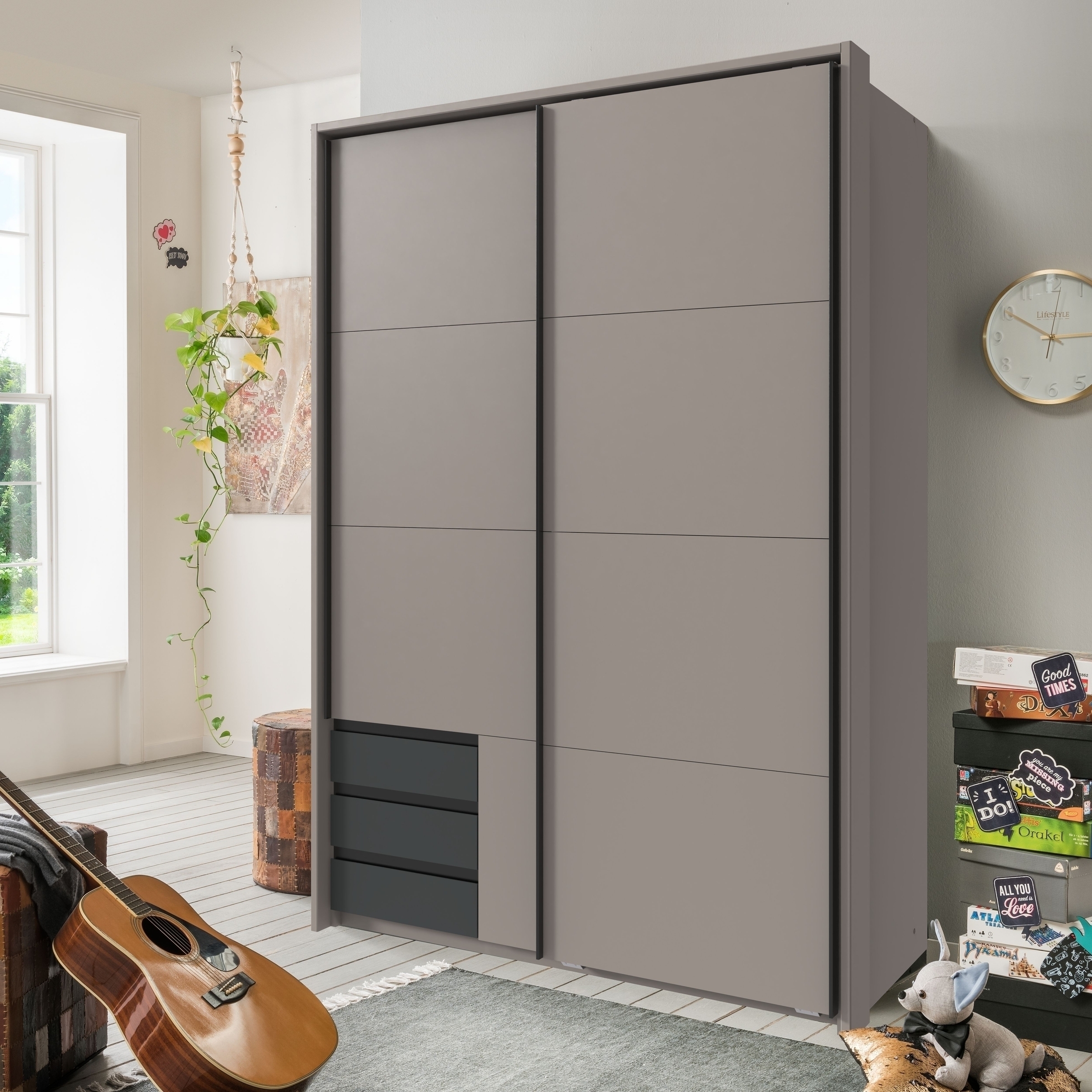 [cWert] => Maße ca. 179/198/65 cm (B/H/T) – großzügiger Schwebetürenschrank mit 2 Türen, 3 Schubladen und viel Stauraum für moderne Kinder- und Jugendzimmer.;Modernes Design in SAHARAGRAU + WEISS mit Griffen in GRAFIT – stilvolle Optik passend zu zeitgemäßen Jugendzimmer Möbeln.;2 Einlegeböden (je ca. 87 cm) und 2 Kleiderstangen (je ca. 87 cm Länge) – flexible Aufbewahrung für Kleidung und Accessoires.;Robuste Holzwerkstoff-Spanplatte – pflegeleichtes, langlebiges Material ideal für den täglichen Einsatz im Jugend- und Kinderzimmer.;Lieferung in 6 Paketen, Gewicht ca. 143,5 kg, zerlegt zur Selbstmontage – inklusive Anleitung, ohne Inhalt und Dekoration.