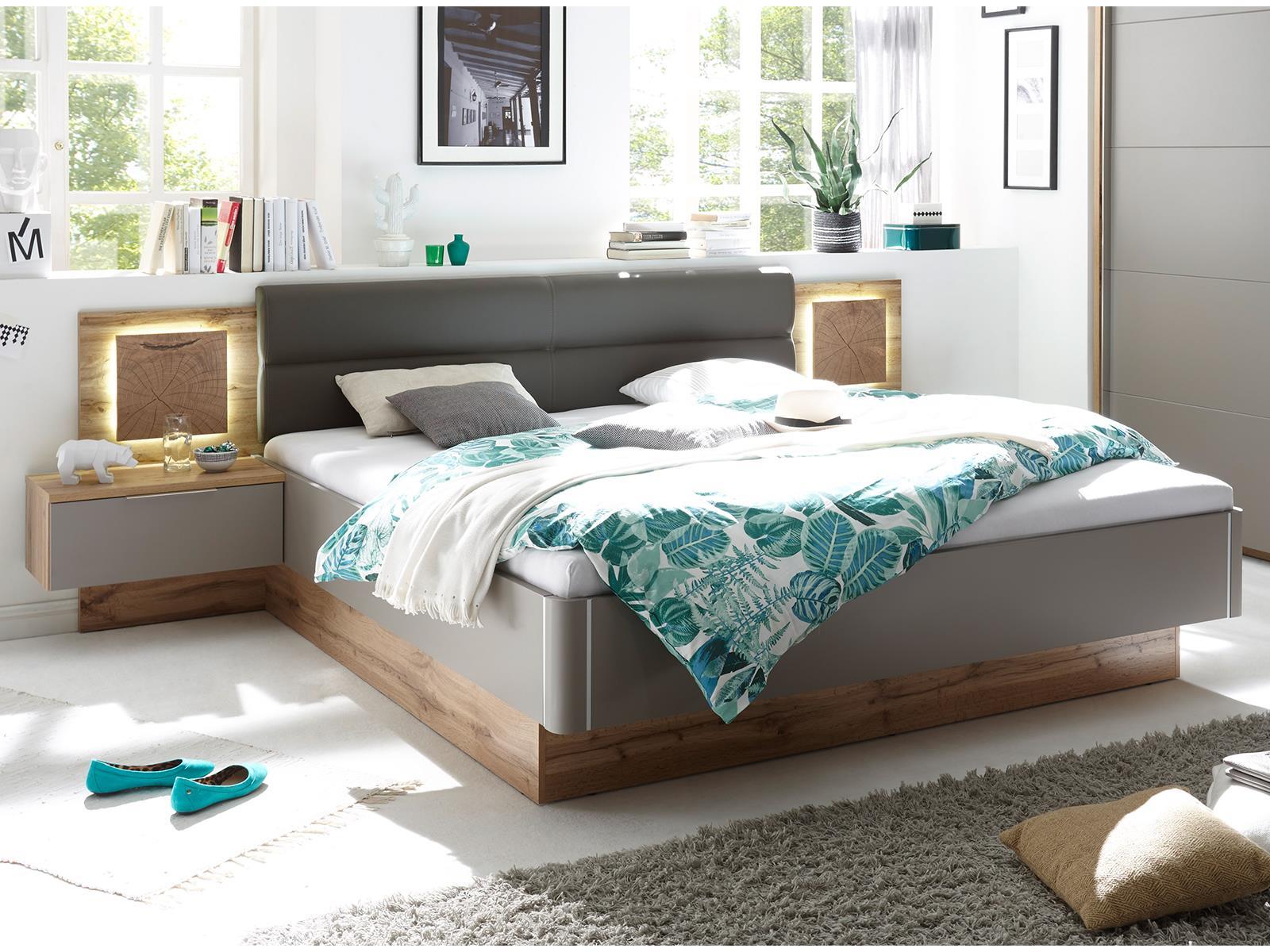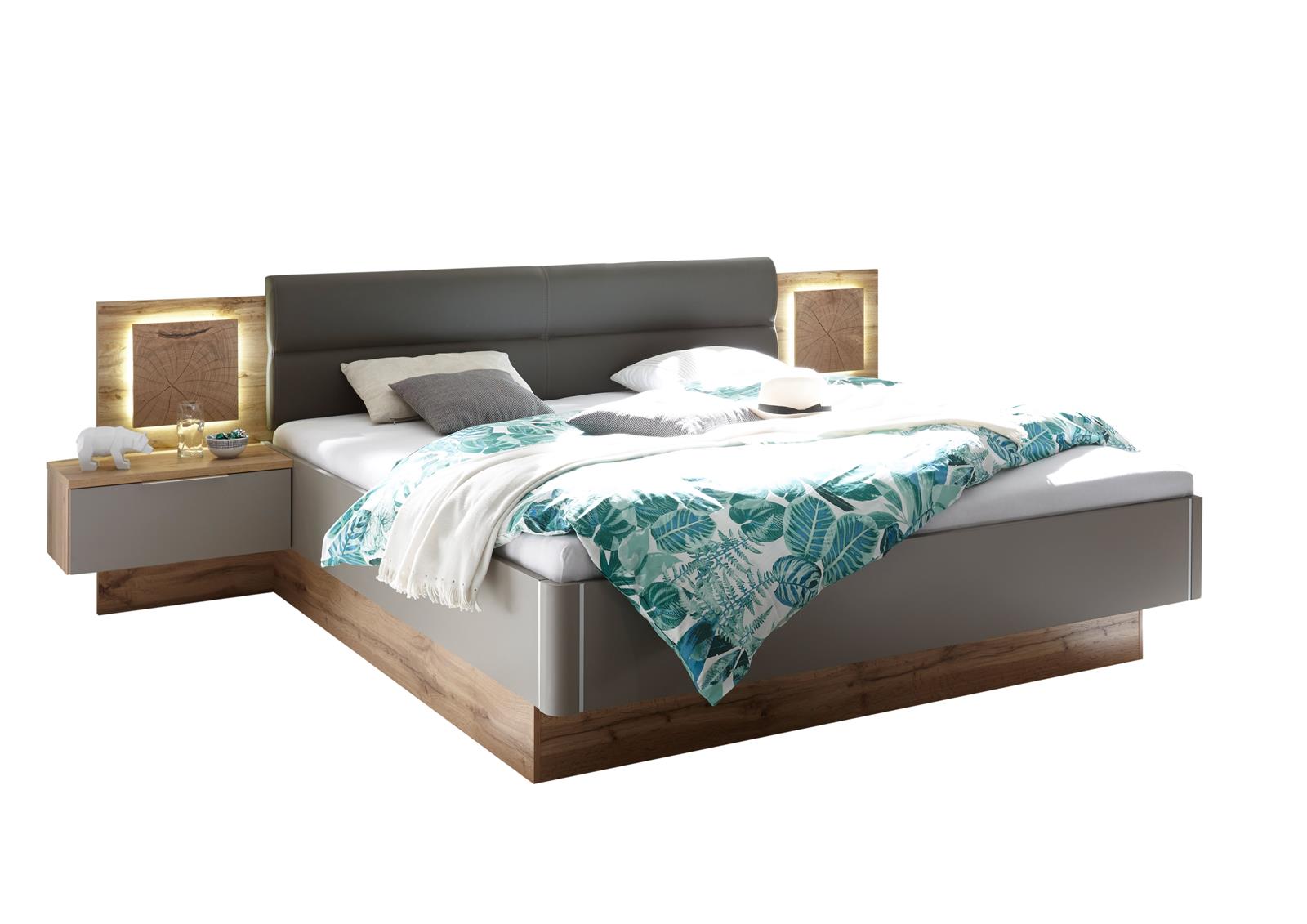 Die Kombination aus Wildeiche Nachbildung und elegantem Basaltgrau mit Absetzungen in extravaganter Hirnholz Nachbildung verleiht dem Bett eine ausdrucksstarke Optik. Das gepolsterte Kopfteil sorgt beim Lesen oder Fernsehen für angenehmen Komfort, während die integrierte LED-Beleuchtung das Schlafzimmer abends in eine stimmungsvolle Wohlfühloase verwandelt.