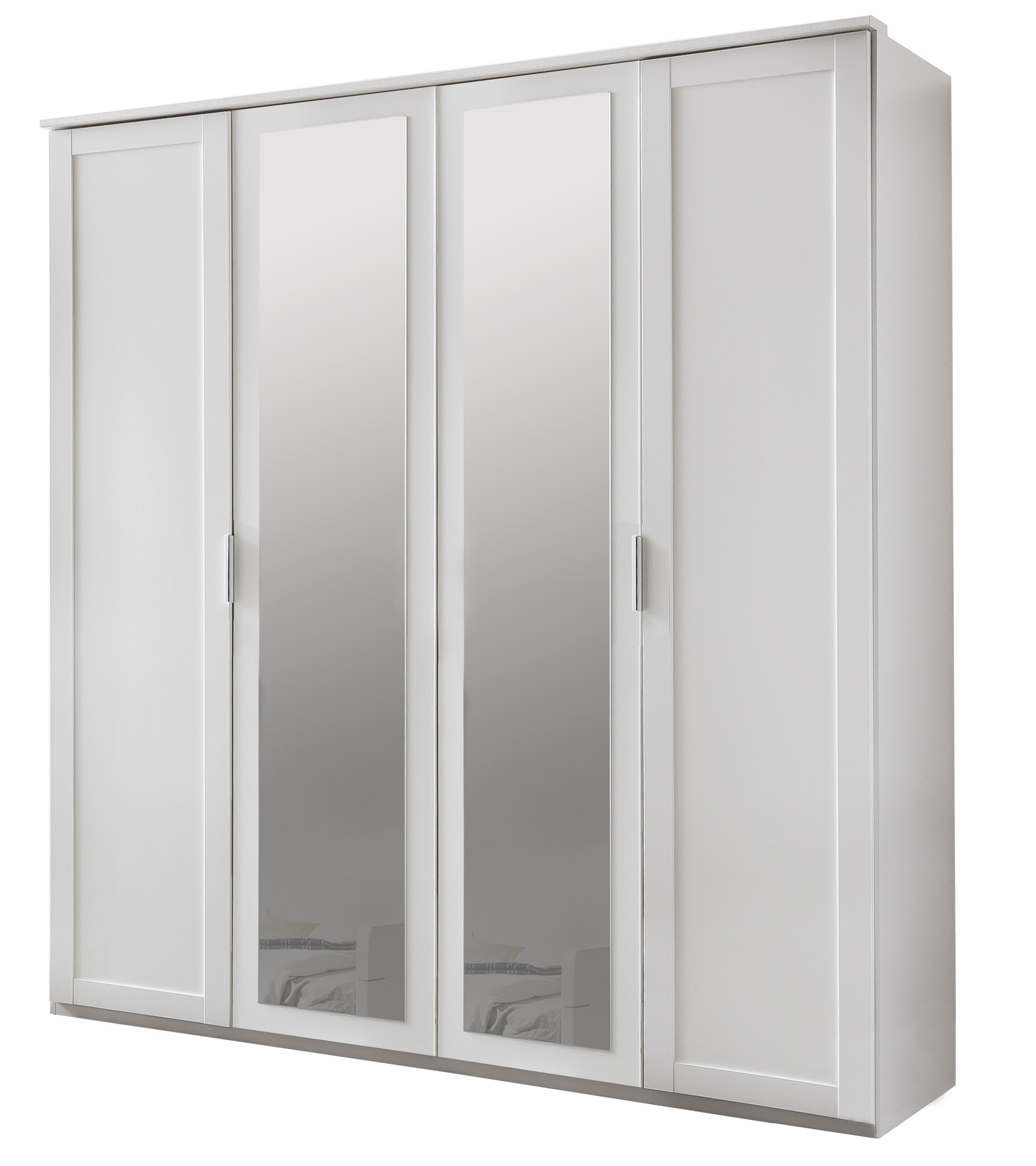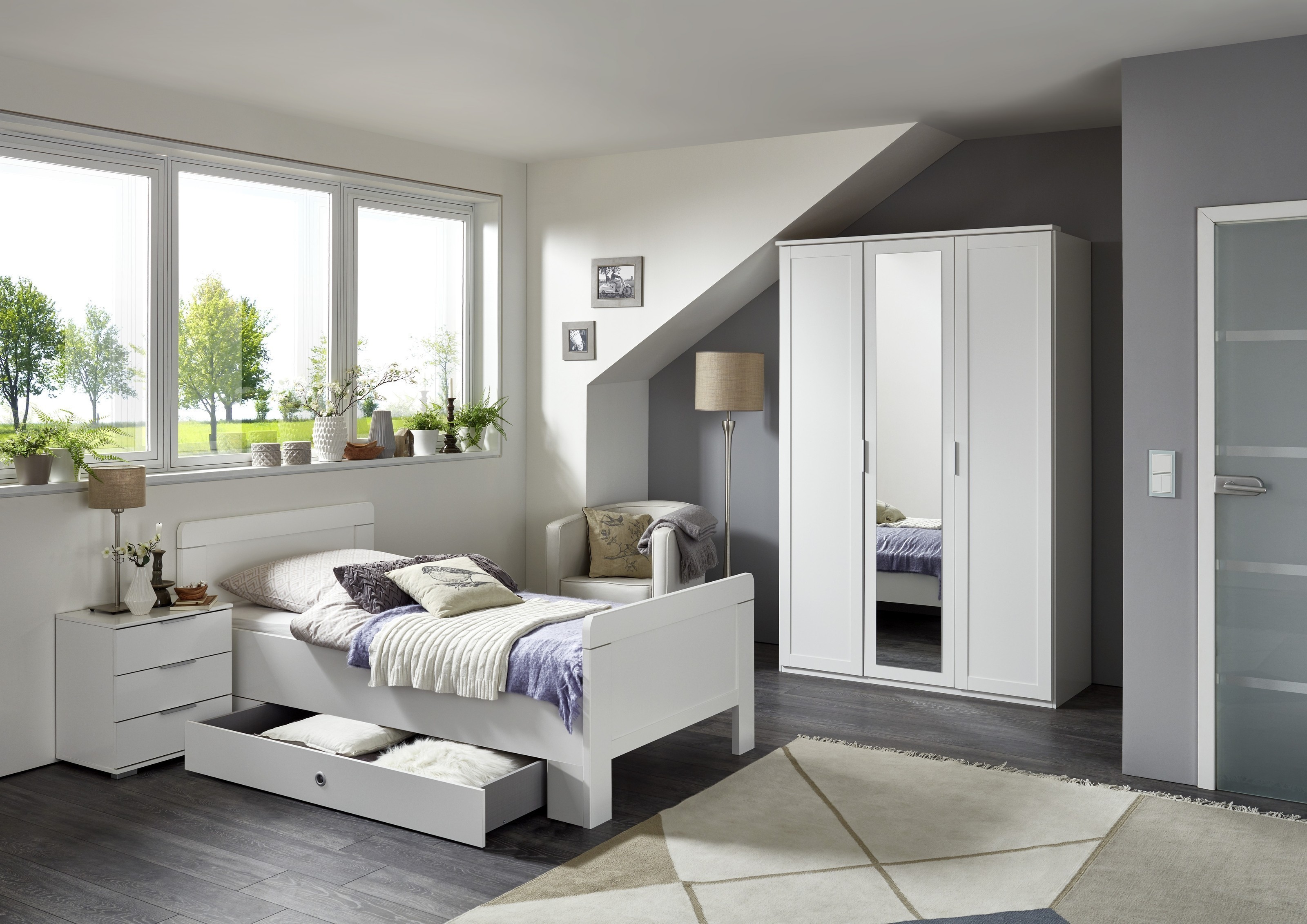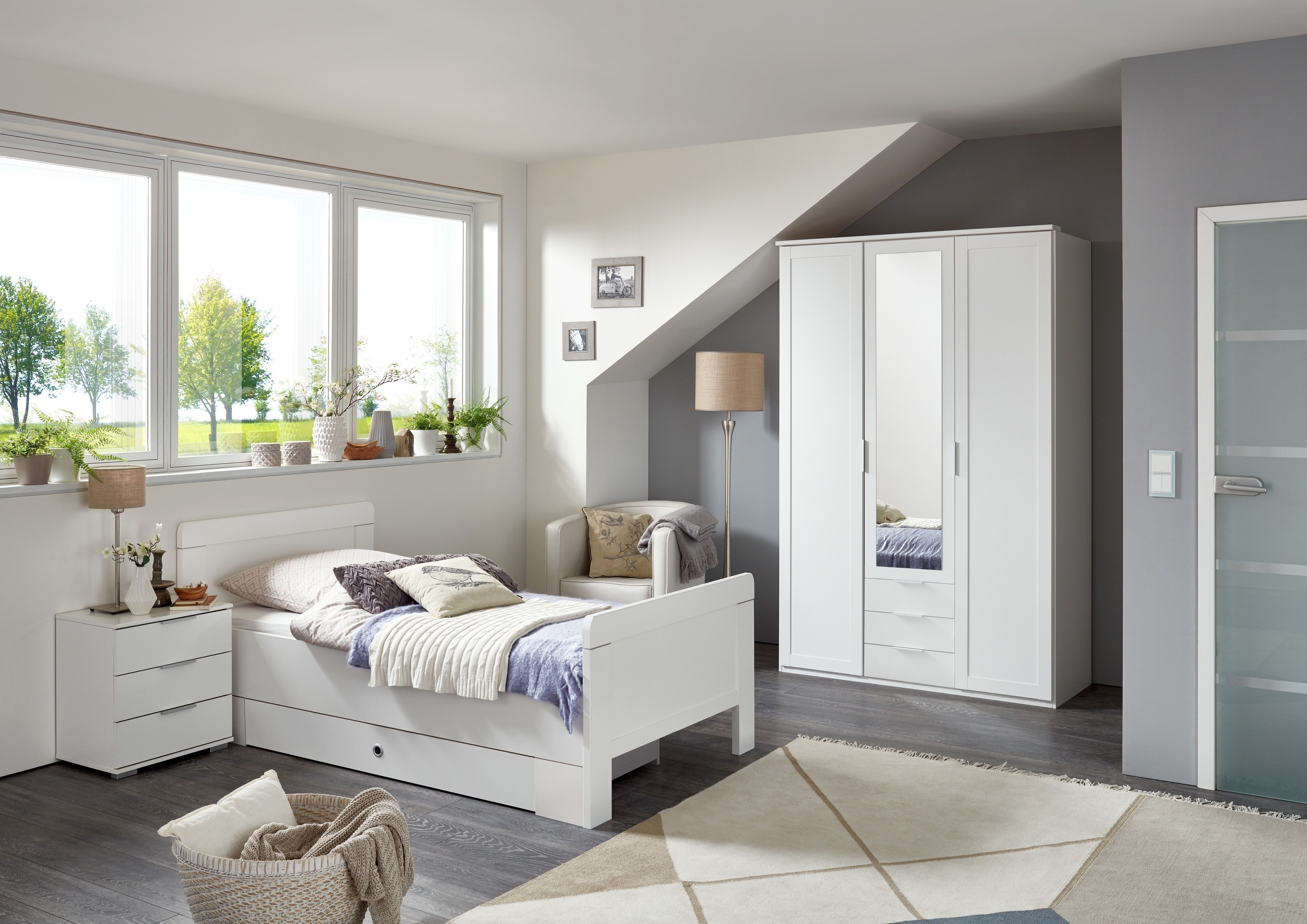Die weiße Ausführung mit linegrey Innendekor sorgt für eine ruhige, moderne Schlafraum-Atmosphäre.