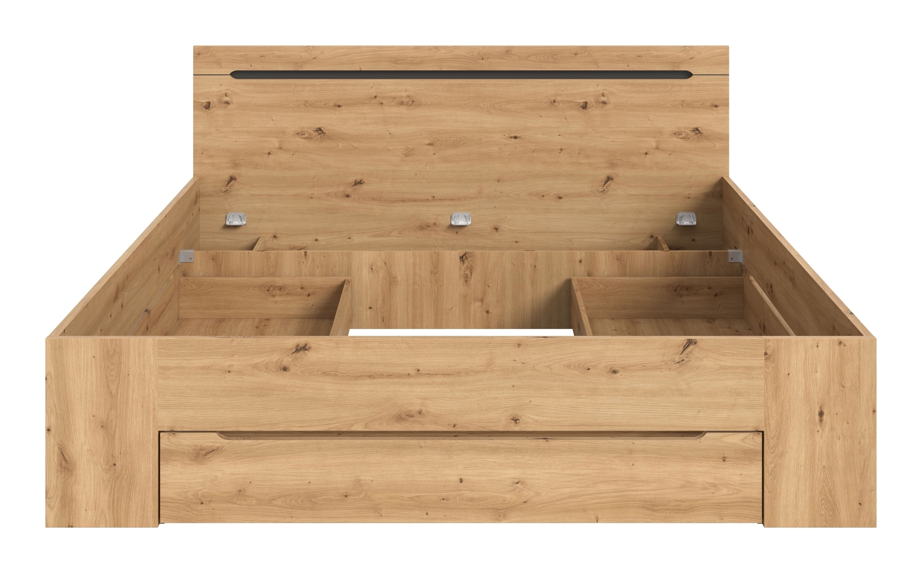 Das Bett verfügt über drei vollausziehbare Schubladen und zwei offene Fächer für zusätzlichen Stauraum.