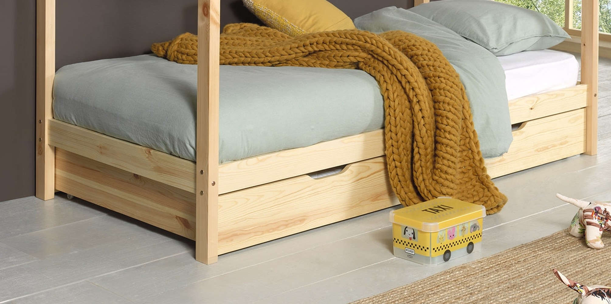 Die Bettschublade DALLAS in Natur ist der passende Bettschubkasten für die Hausbett Serie Dallas von VIPACK und schafft im Kinderzimmer praktischen zusätzlichen Stauraum. Ob Decken, Kissen oder Bettwäsche – alles findet ordentlich und griffbereit direkt unter dem Bett seinen Platz.
