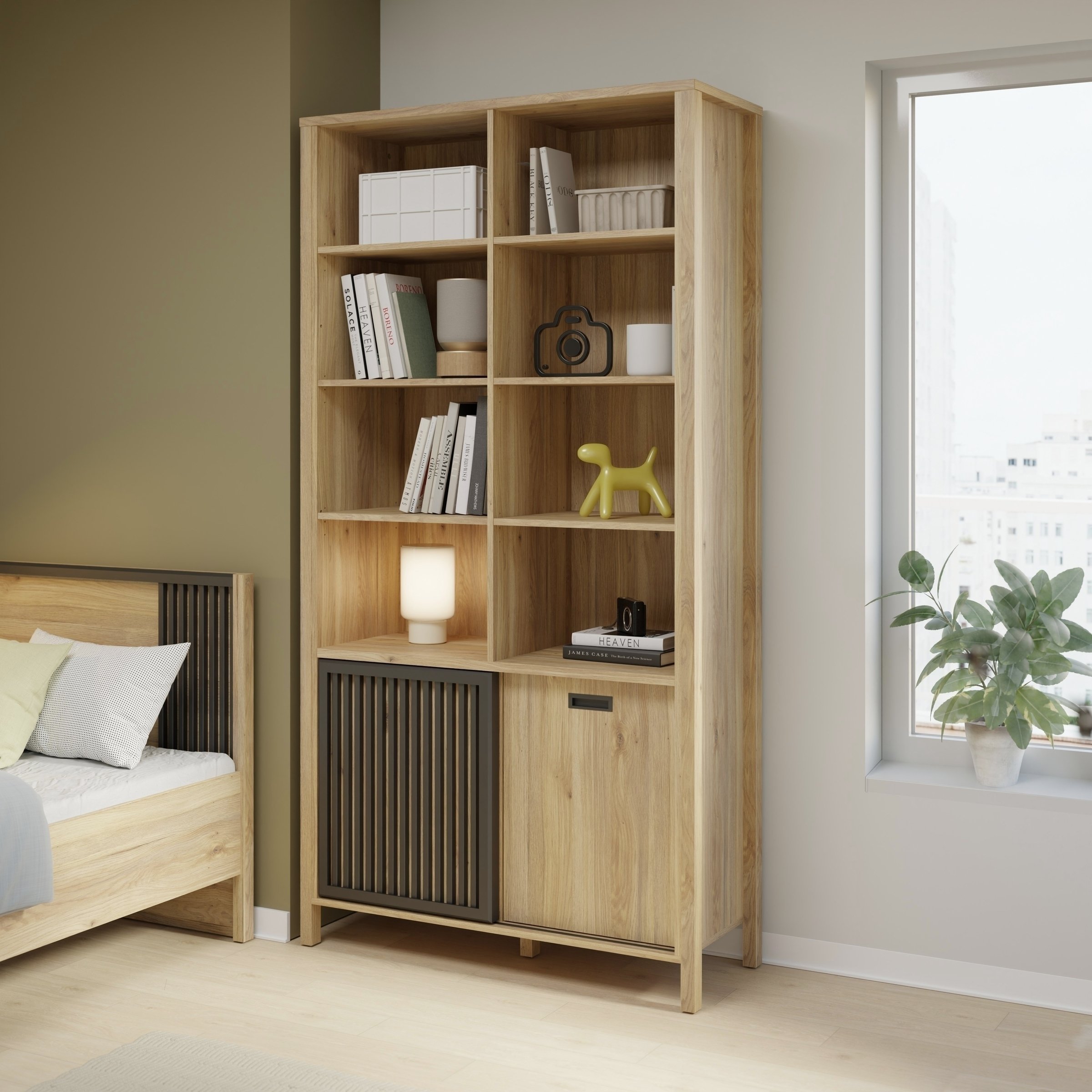 [Bullet-Point 4] => Mit einem Ablageboden bietet das Regal Platz für Bücher, Dekorationen und persönliche Gegenstände, perfekt für die Organisation Ihres Wohnraums.