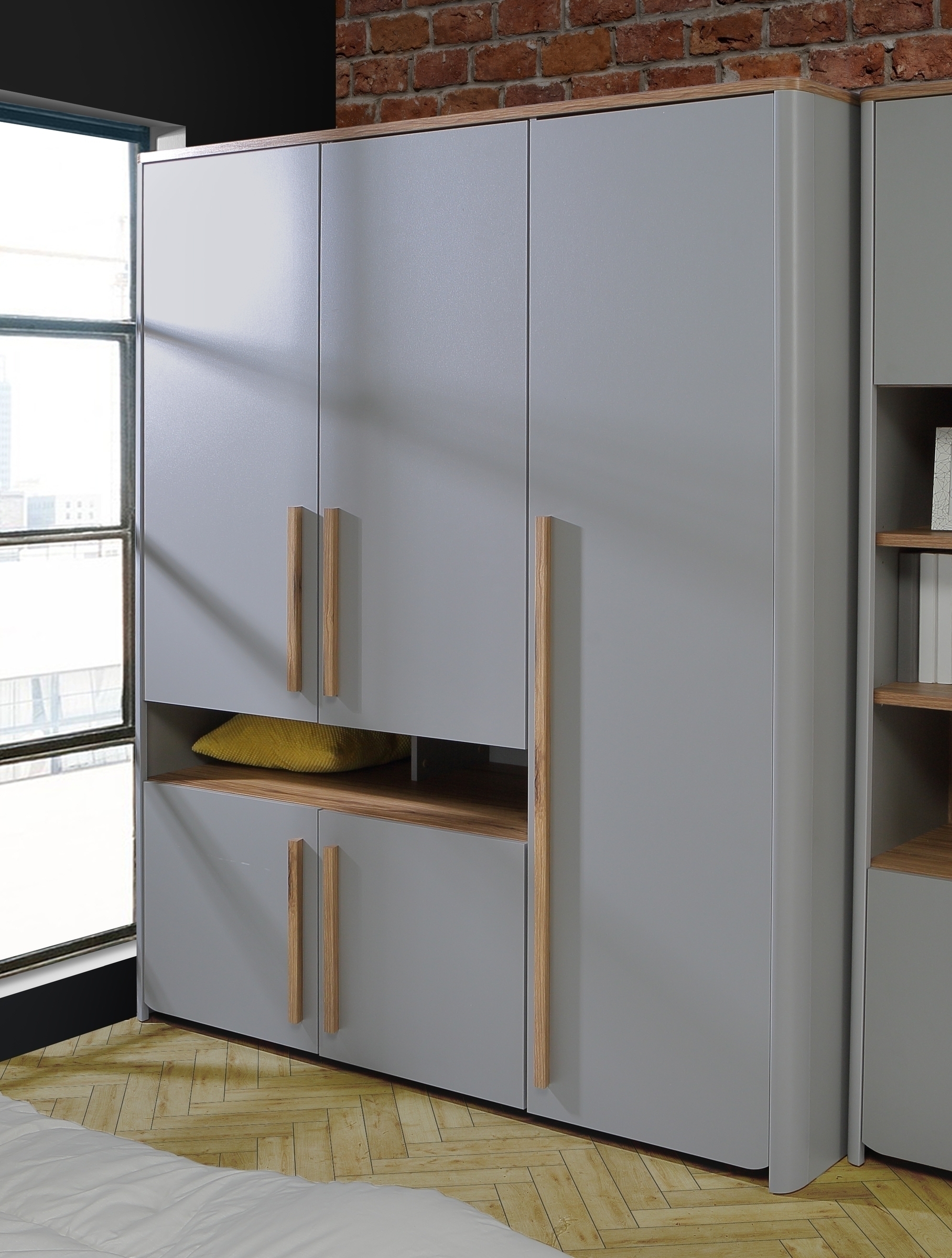 Die graue Front mit Griffleiste in Catania Eiche fügt sich stilvoll in moderne Schlafzimmer ein.
