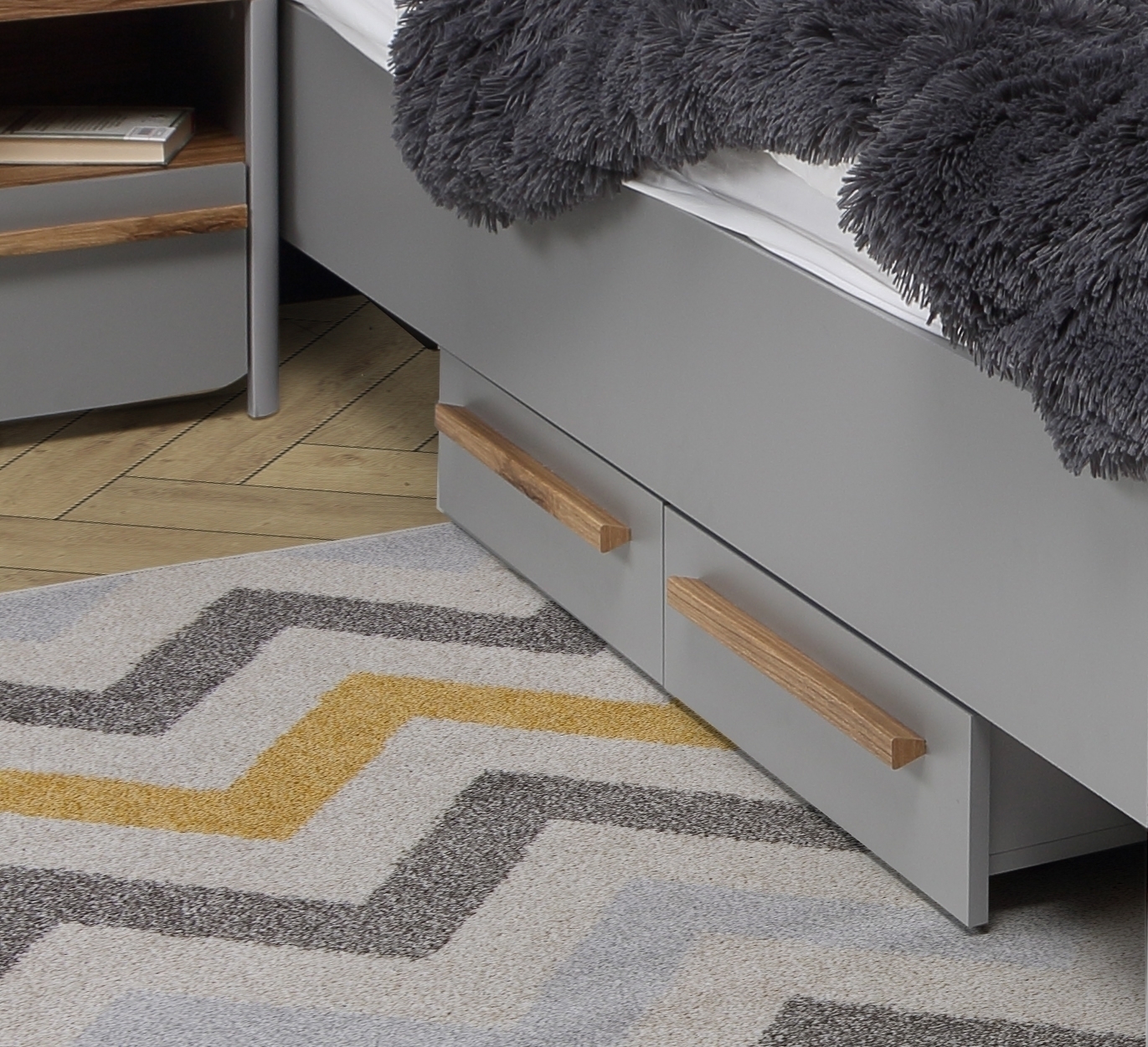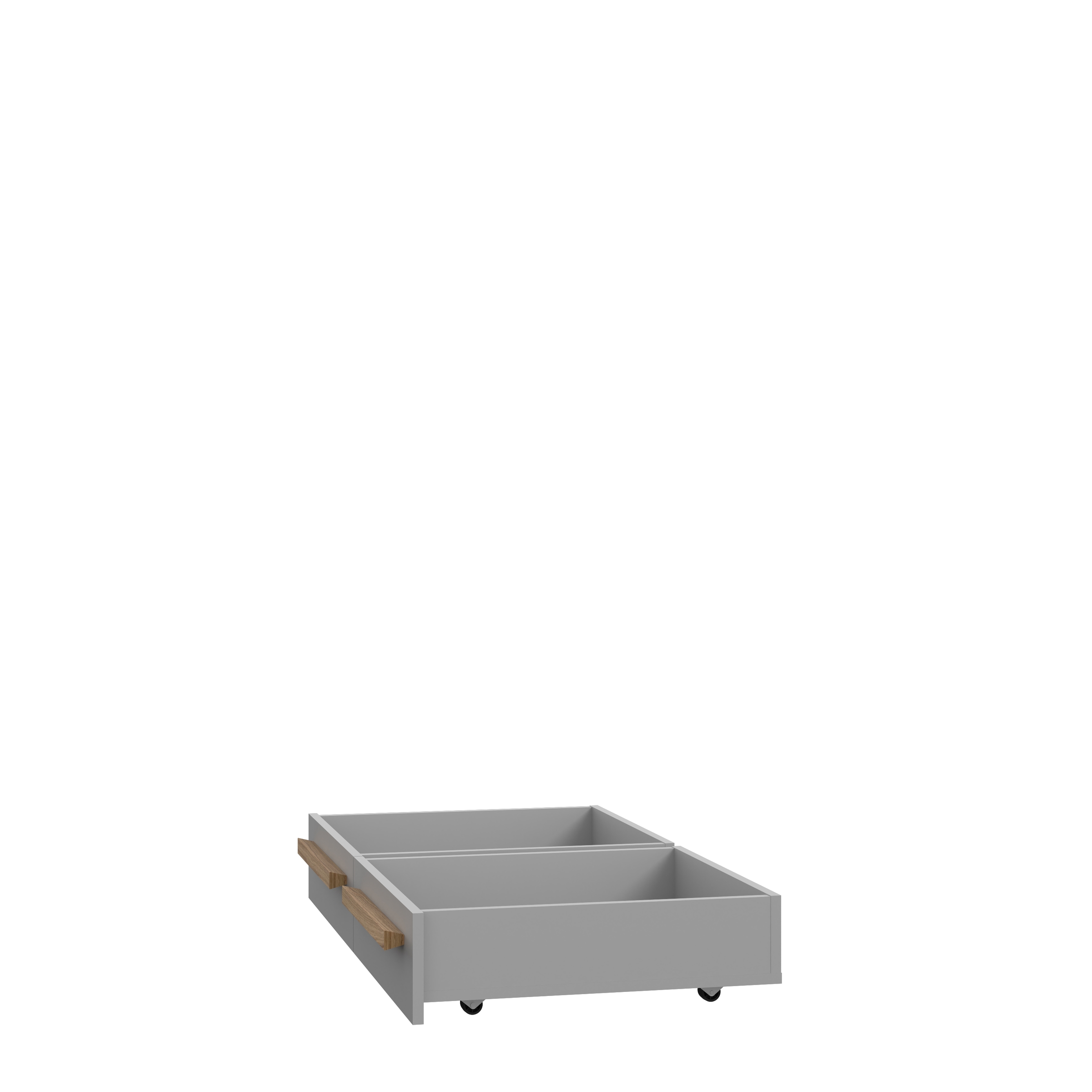 Optisch überzeugt der Bettschubkasten durch sein modernes Design in Grau, das von einer Griffleiste aus MDF in Catania Eiche stilvoll akzentuiert wird. Die schwarzen Kunststofffüße greifen die zeitgemäße Gestaltung auf und sorgen zugleich für einen stabilen Stand. Dank der Griffleiste lassen sich die Schubladen komfortabel öffnen und schließen, was die tägliche Nutzung besonders angenehm macht.