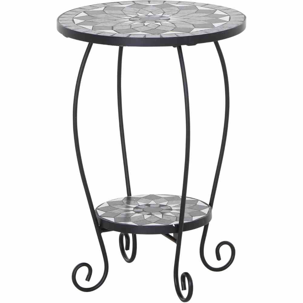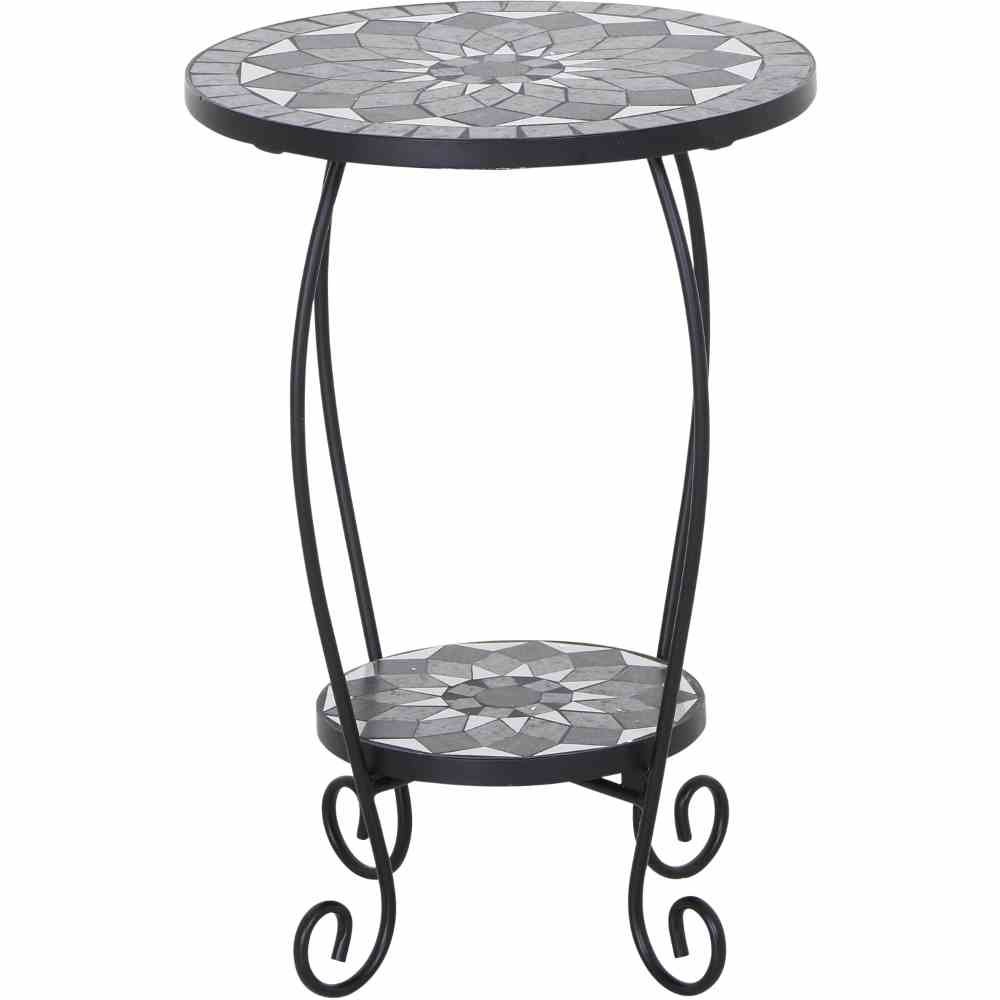 Das elegante Design in matt schwarz und dunkelgrau mit dekorativer Mosaikoptik verleiht Garten, Terrasse oder Wohnzimmer eine moderne Note. Dank der weißen, rutschhemmenden Kunststoffgleiter steht der Blumentisch stabil auf unterschiedlichen Untergründen und schont zugleich empfindliche Böden.