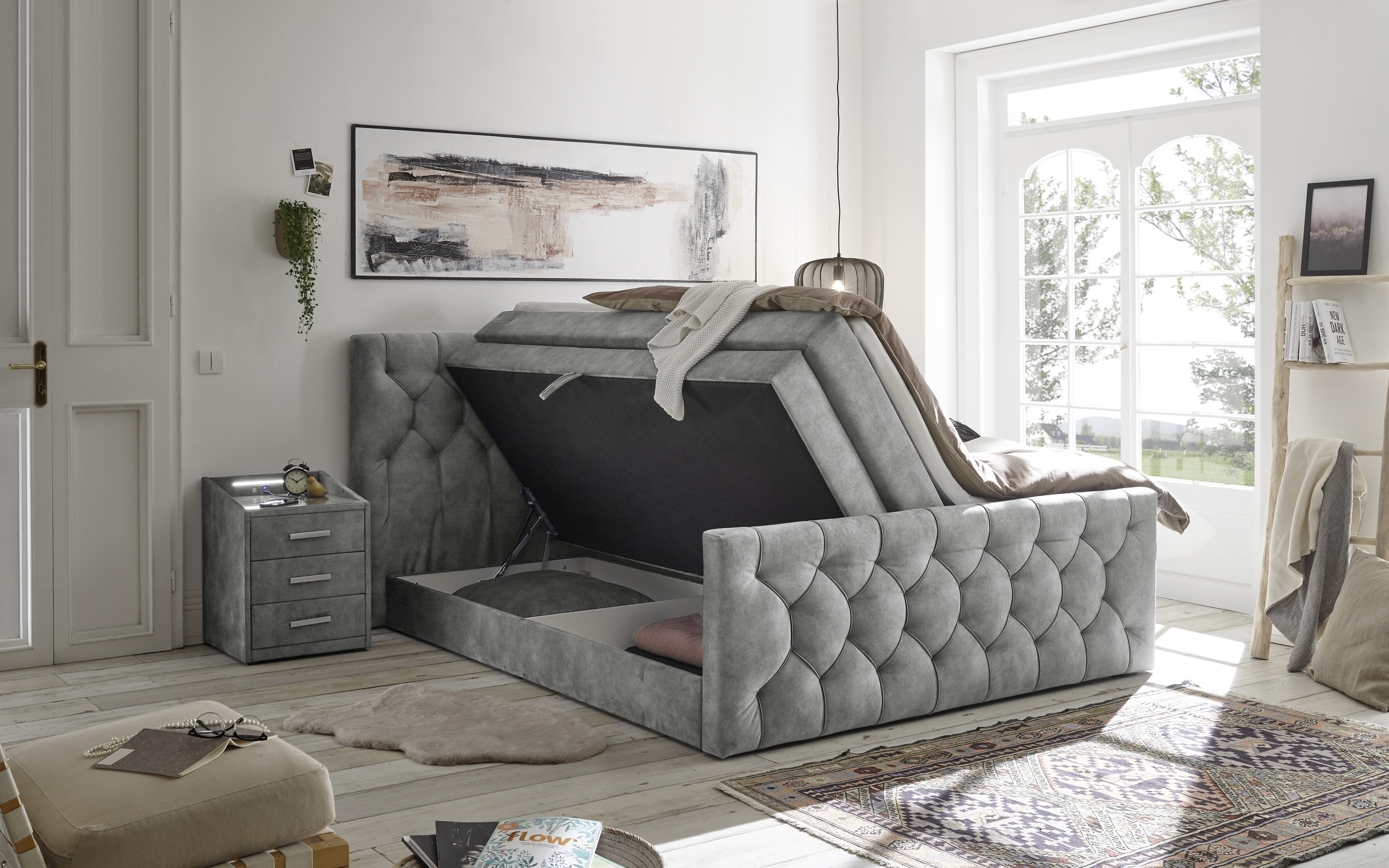 Optisch überzeugt das Boxspringbett Cashfield durch seinen hellgrauen, gesteppten Bezug aus 100 % Polyester und das aufwendig gepolsterte Kopf- und Fußteil mit außergewöhnlicher Steppung. Zwei integrierte Bettkästen bieten zusätzlichen Stauraum und machen das Bett zu einem funktionalen Highlight in Ihrem Schlafzimmer.