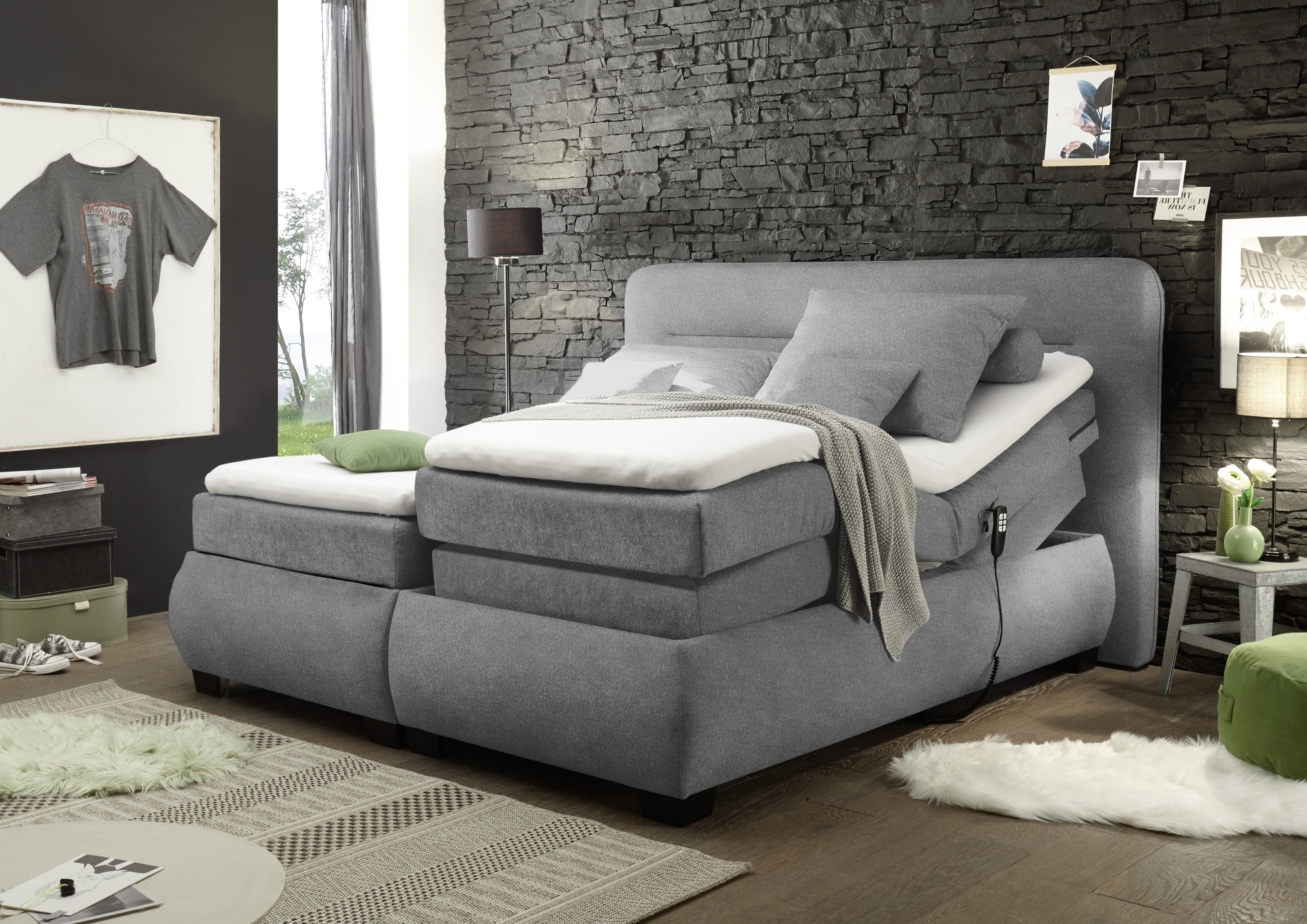 Dank des integrierten Motorantriebs lässt sich die Liegefläche individuell verstellen – wahlweise nur im Kopf- oder Fußbereich. So finden Sie jederzeit Ihre optimale Schlaf- oder Relaxposition, sei es zum Lesen, Fernsehen oder einfach zum entspannten Hochlagern der Beine.