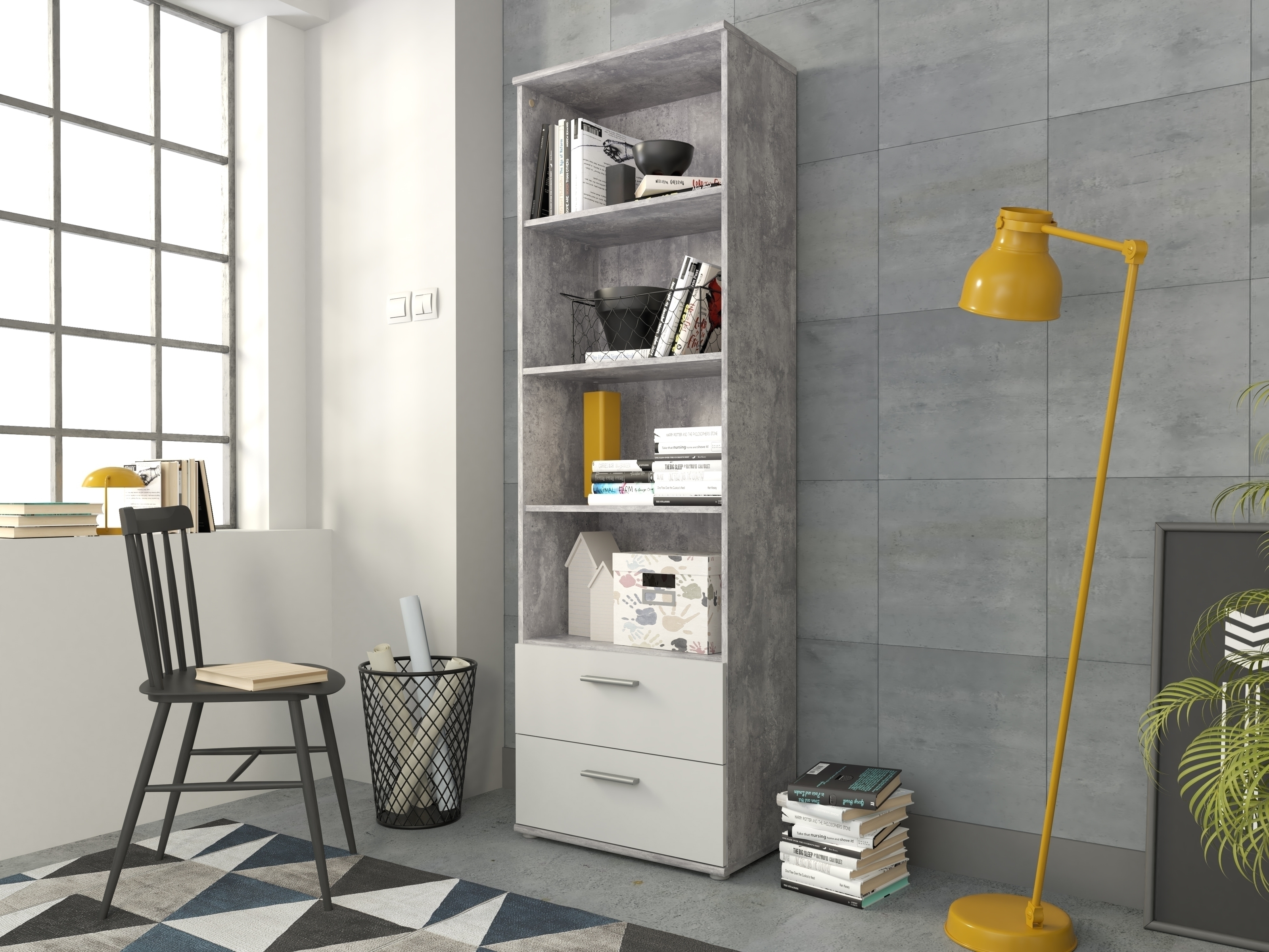 [1] => Buecherregal-LUPO-mit-2-Schubladen-und-4-Boeden-in-Betonoptik-Lichtgrau-602x1879x348cm-BxHxT