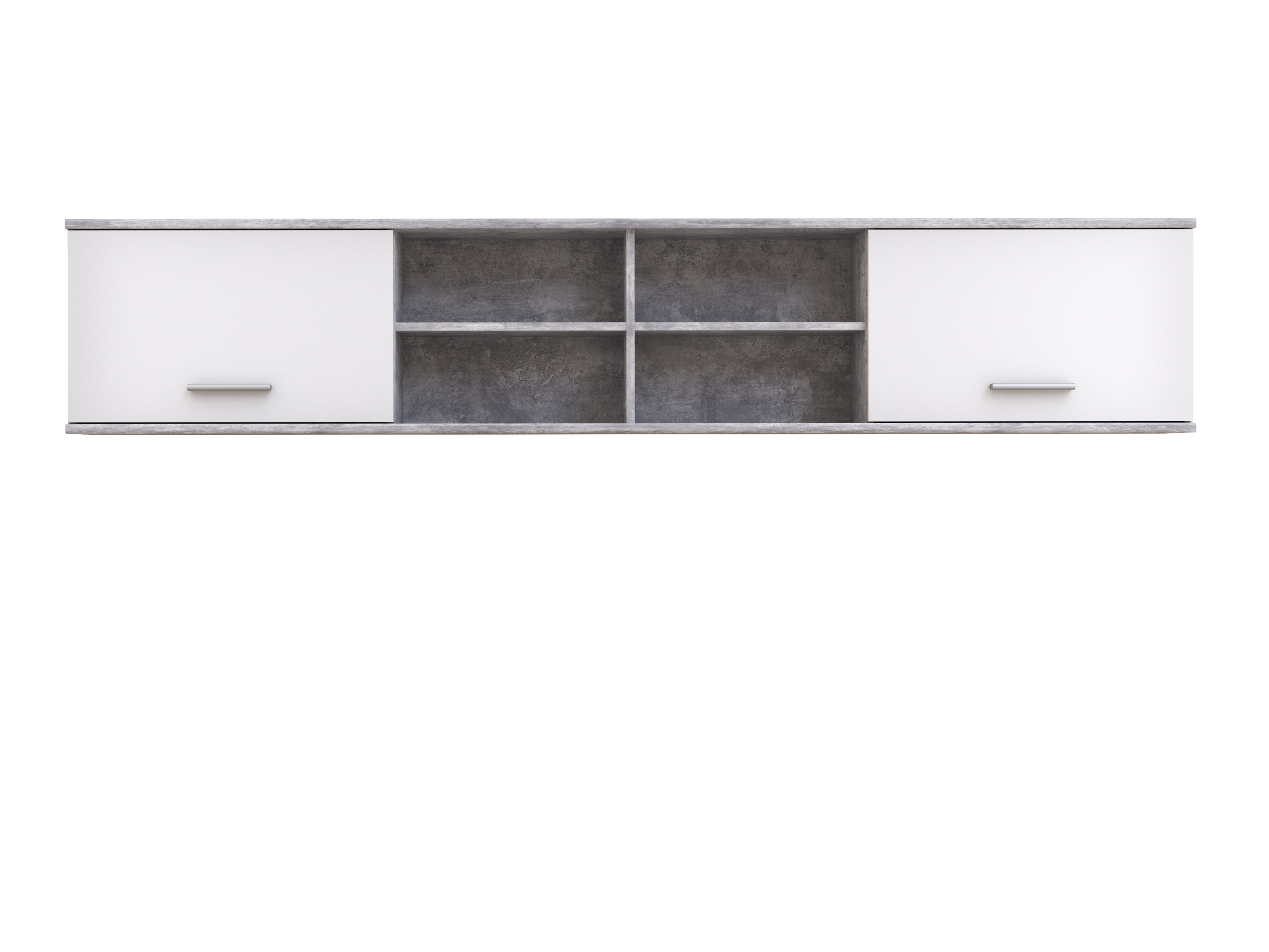 ;Stilvolles Design in Betonoptik: Der Korpus des Wandregals LUPO in Betonoptik Lichtgrau und die weißen Akzente verleihen Ihrem Raum einen modernen und eleganten Look. Perfekt für ein zeitgemäßes Wohnambiente.;Robuste Materialien und hochwertige Verarbeitung: Das Wandregal LUPO besteht aus strapazierfähiger Spanplatte mit einer Folienbeschichtung. ;Praktische Aufteilung mit viel Stauraum: Ausgestattet mit zwei Türen und vier offenen Fächern, bietet das Wandregal LUPO vielseitige Aufbewahrungsmöglichkeiten. Die Griffe in Aluminiumeffekt aus Kunststoff sind 14,8 cm lang und praktisch im Gebrauch.;Einfache Montage dank zerlegtem Lieferzustand: Das Wandregal LUPO wird zerlegt geliefert, was den Transport erleichtert und Ihnen ermöglicht, es schnell und unkompliziert selbst zusammenzubauen. Ideal für einen flexiblen und bequemen Aufbau.