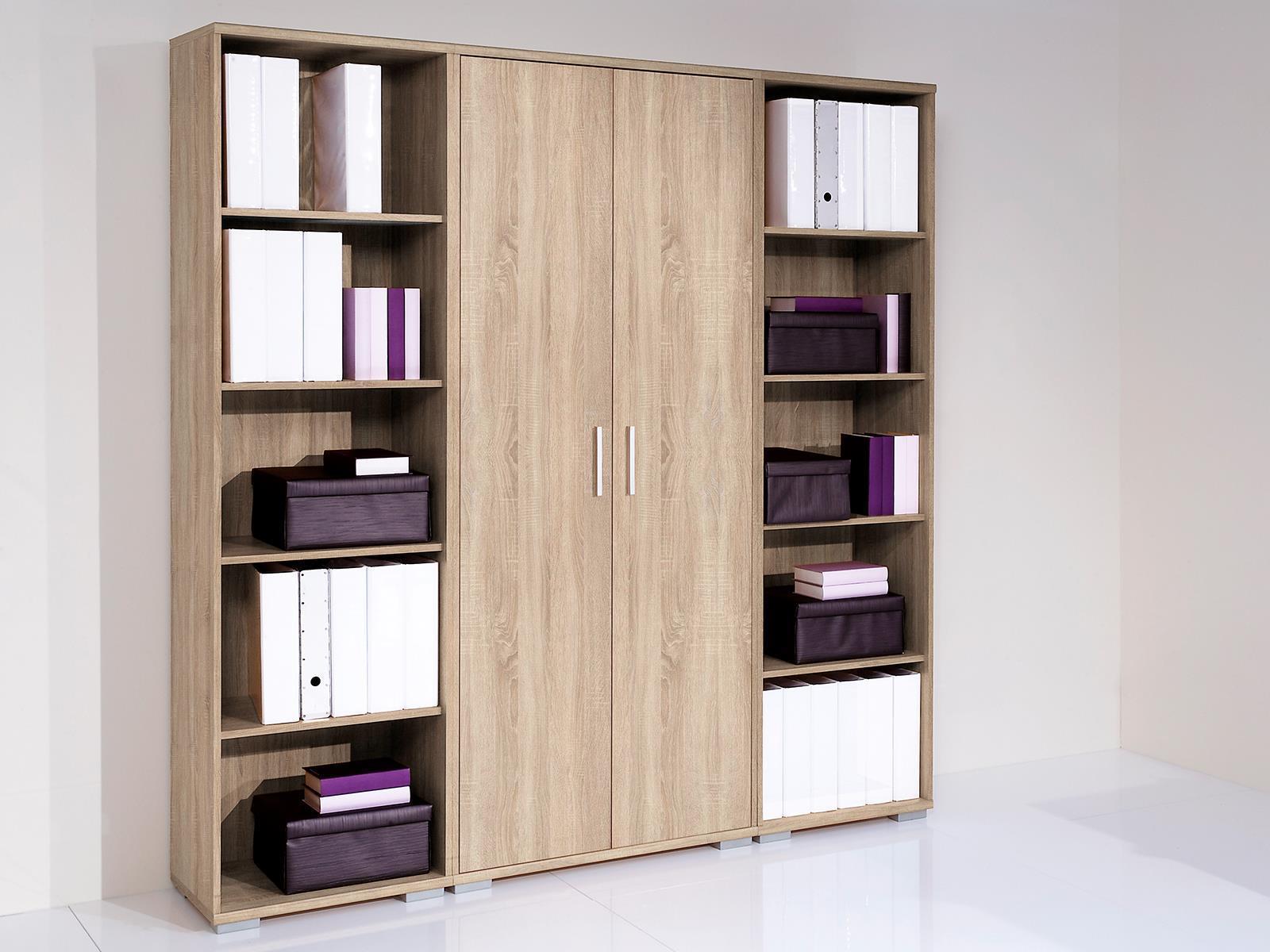 • Aktenschrank mit zwei Türen und zwei passende Regale bieten übersichtlichen Stauraum für Ordner und Bücher