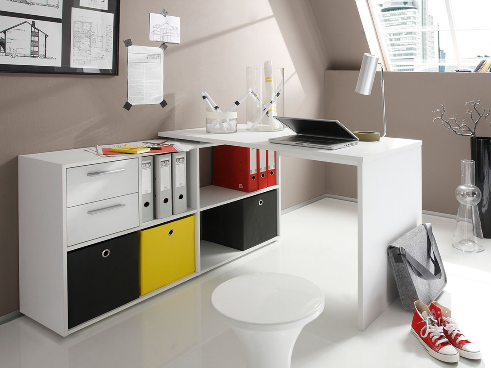 Regal und Eckschreibtisch bilden einen übersichtlichen Arbeitsplatz mit viel Stauraum.