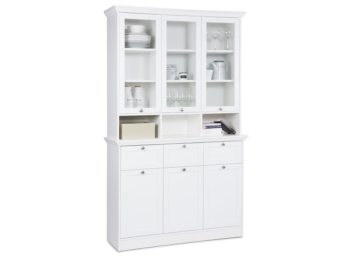 Ob in der Küche als zusätzlicher Stauraum für Geschirr und Vorräte oder im Esszimmer für dein gutes Porzellan – der Schrank ist vielseitig einsetzbar. Die drei Rahmentüren, drei Glastüren und drei Schubkästen bieten Platz für alles, was du griffbereit halten möchtest. Dahinter verstecken sich neun Ablagefächer und drei offene Fächer, die für Ordnung sorgen.