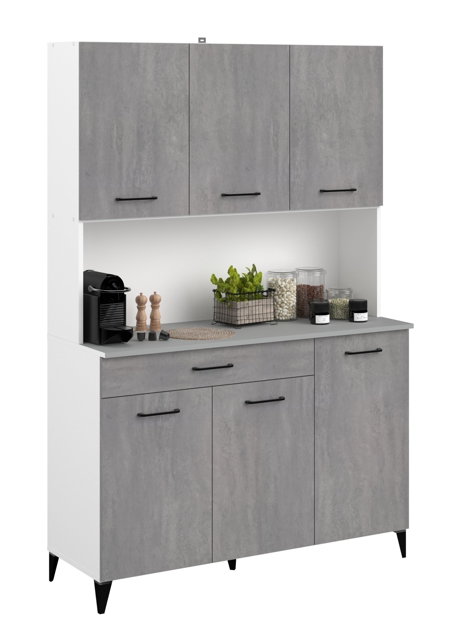 Die Kombination aus Beton Optik hell und weiß verleiht dem Mehrzweckschrank eine moderne, leicht industrielle Note und sorgt gleichzeitig für Helligkeit im Raum. Dank 6 Türen, 8 Fächern, einem großen offenen Fach und einem Schubkasten haben Sie alles von sichtbar dekoriert bis dezent verstaut stets gut organisiert.