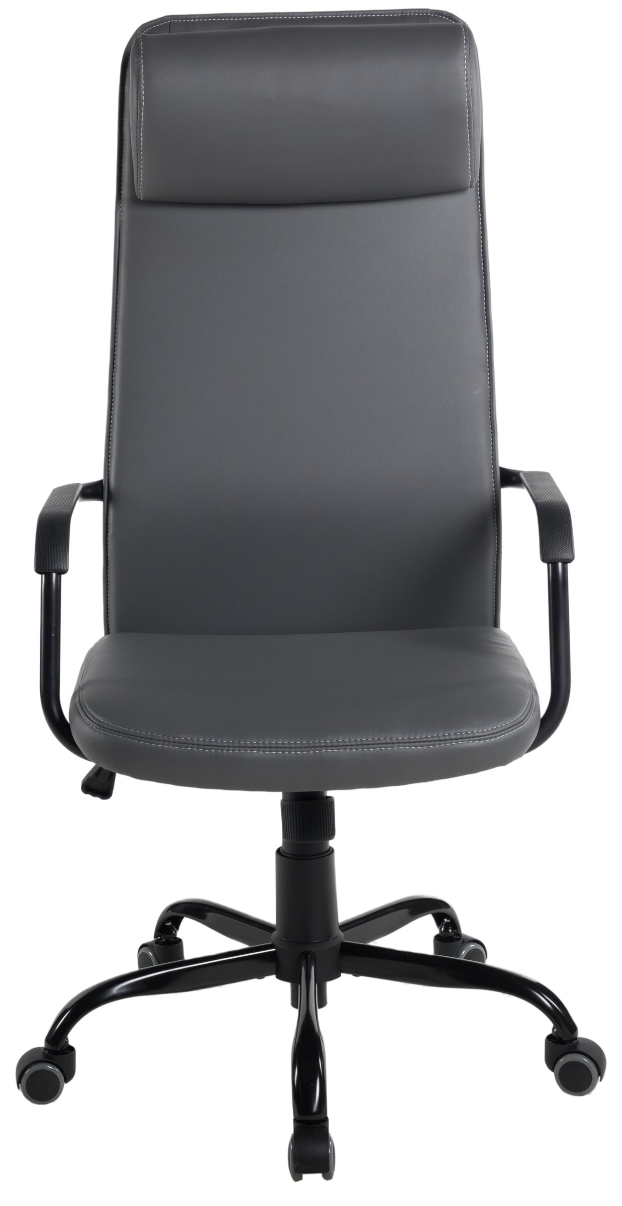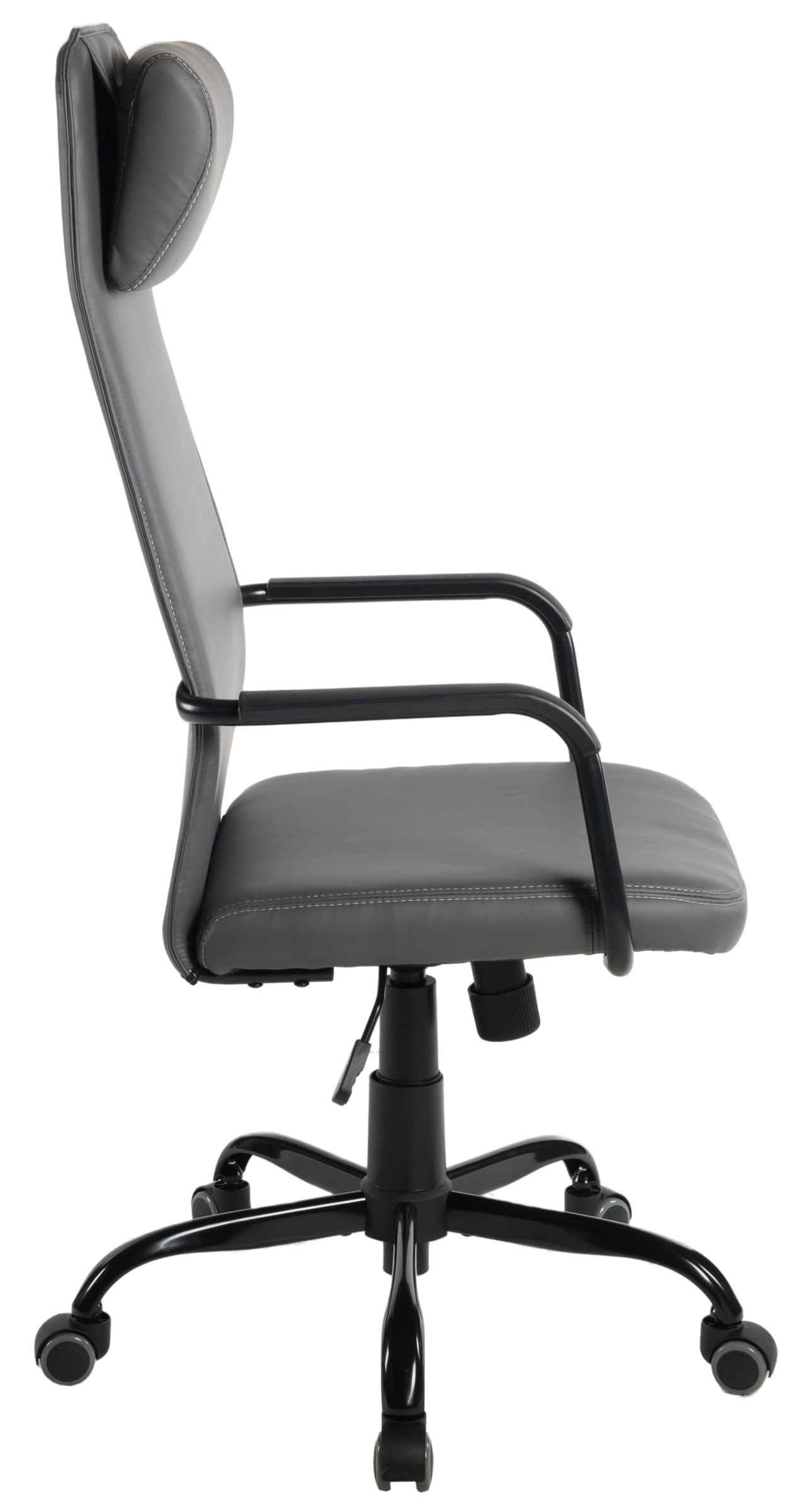 Ein pflegeleichter Bezug aus dunkelgrauem Kunstleder mit farblich abgesetzten Ziernähten sorgt für eine elegante Optik und eine angenehme Haptik. Die ergonomisch geformte Rückenlehne mit zusätzlicher Rückenunterstützung entlastet den Rücken und bietet auch bei längerem Sitzen spürbaren Komfort.