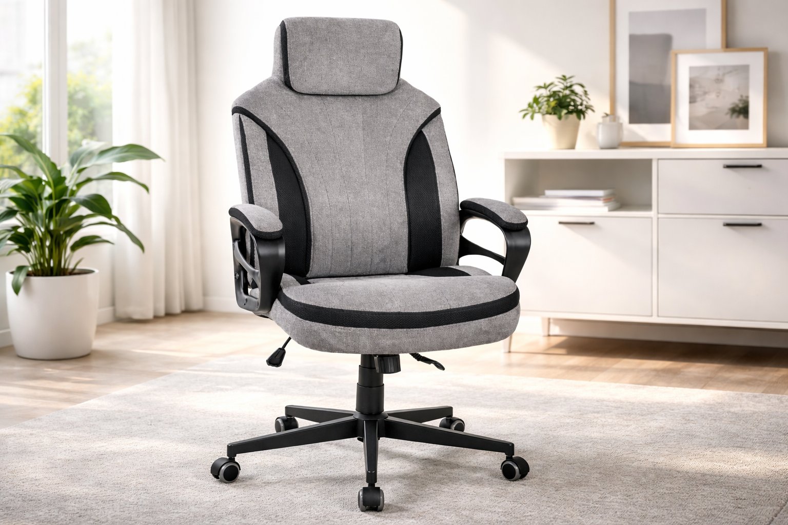 Das stabile Gestell aus Metall und Polypropylen trägt bis zu 110 kg und garantiert einen sicheren Stand. Die fünf gebremsten Sicherheitsdoppelrollen ermöglichen eine einfache Bewegung auf festen Bodenbelägen wie Laminat oder Fliesen. Dank der teilgepolsterten Armlehnen und der ergonomisch geformten Rückenlehne mit zusätzlicher Unterstützung kannst du stundenlang bequem sitzen.