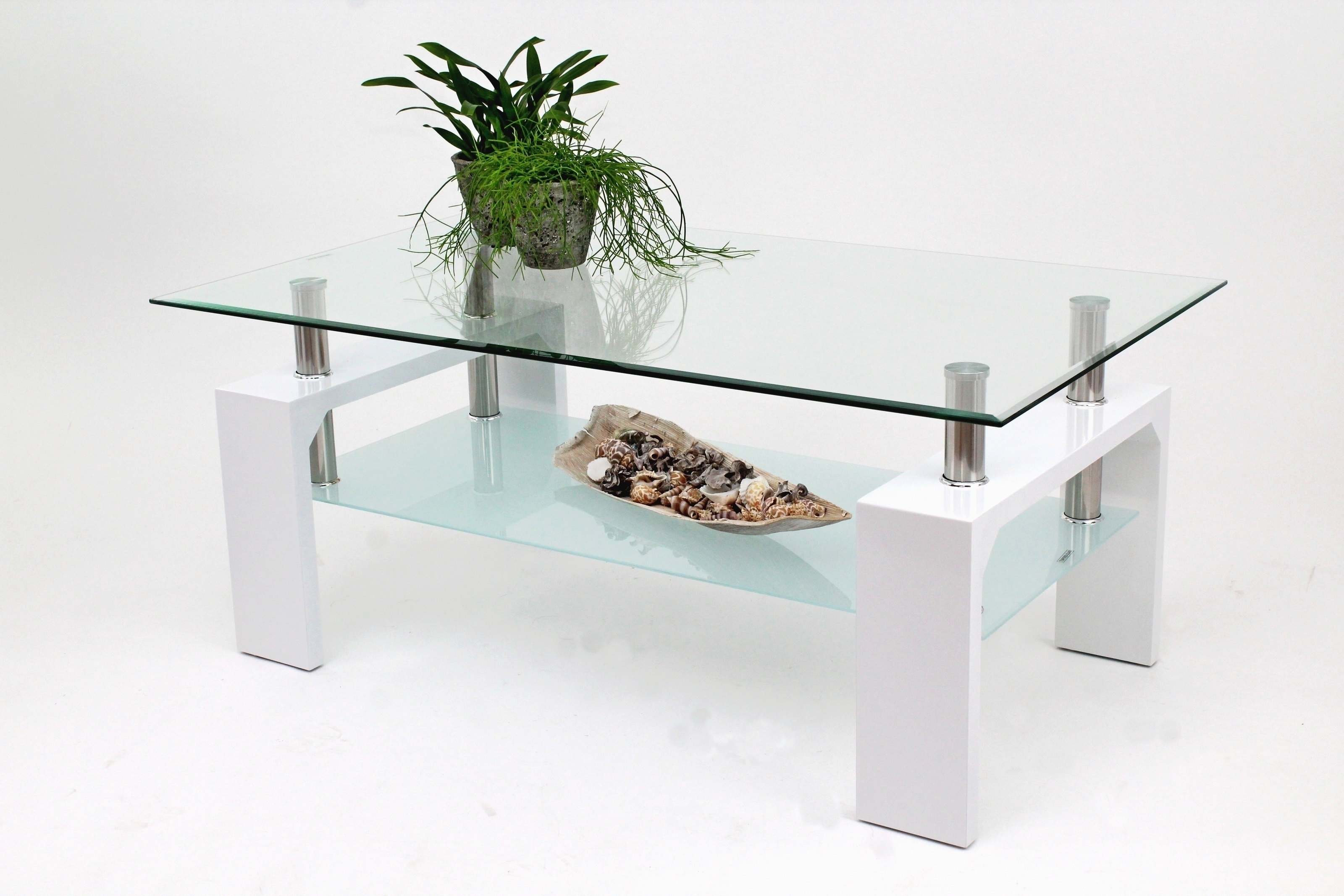 Die hochwertige Tischplatte aus Klarglas und das robuste, weiß lackierte MDF-Gestell schaffen eine harmonische Optik, während die zusätzliche Ablage unter der Glasplatte praktischen Stauraum für Bücher, Zeitschriften oder Deko bietet.