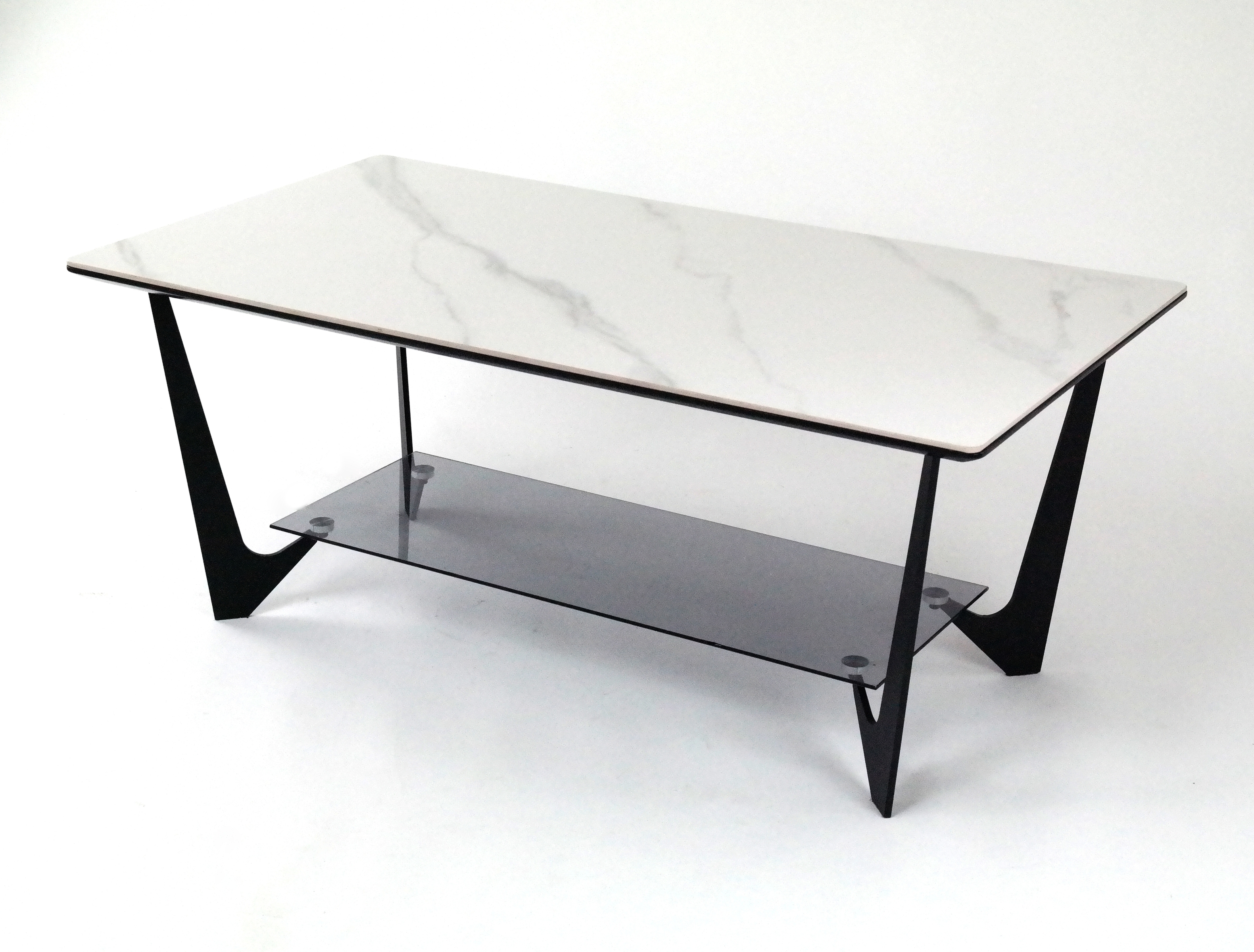 Die Tischplatte aus marmoriertem Eisen in hochglänzendem Weiß wird zum edlen Blickfang und unterstreicht ein modernes Wohnambiente. Der integrierte Ablageboden aus robustem Rauchglas schafft zusätzlichen Stauraum, sodass Zeitschriften, Fernbedienungen oder Bücher immer griffbereit und zugleich ordentlich verstaut sind.