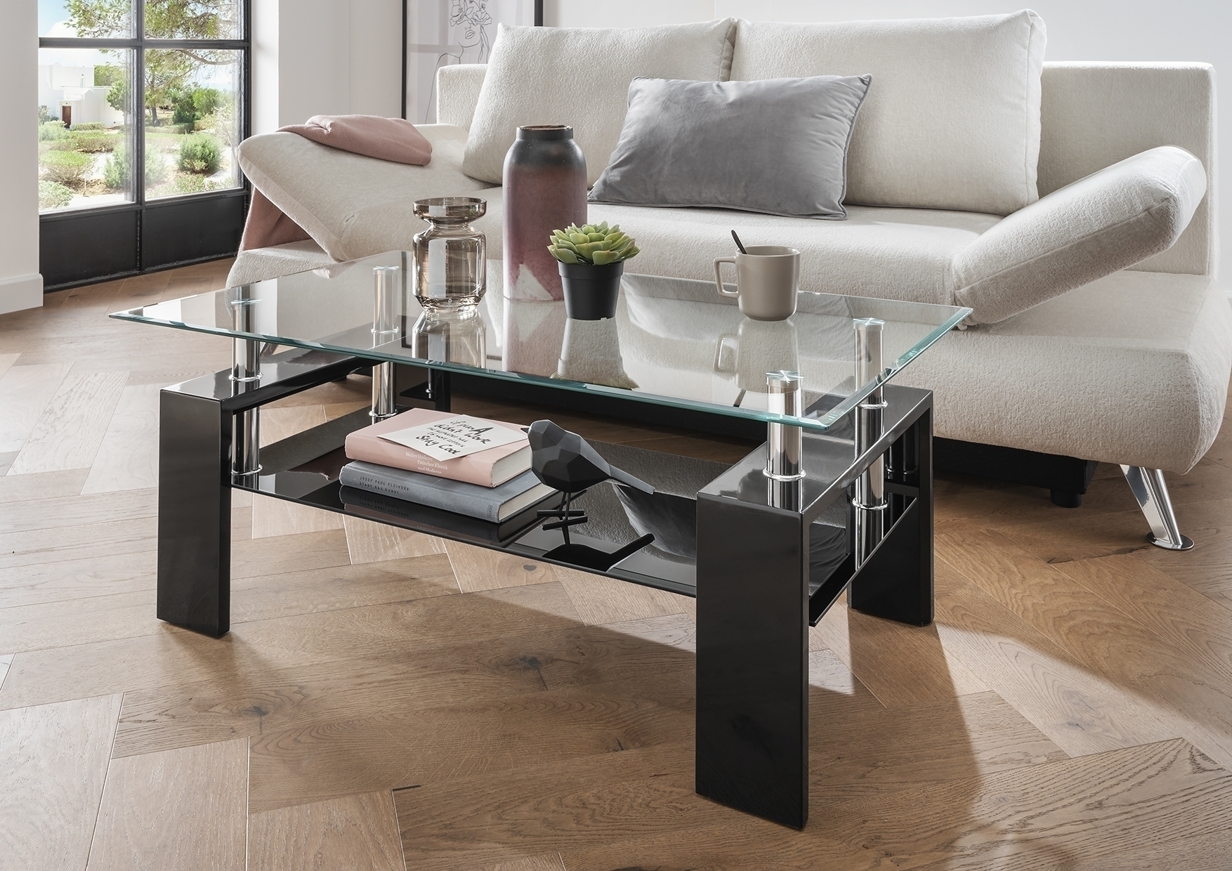 Couchtisch 5/216-05 von freiraum – Couchtisch mit Klarglasplatte und Ablagefläche aus schwarzem Glas
