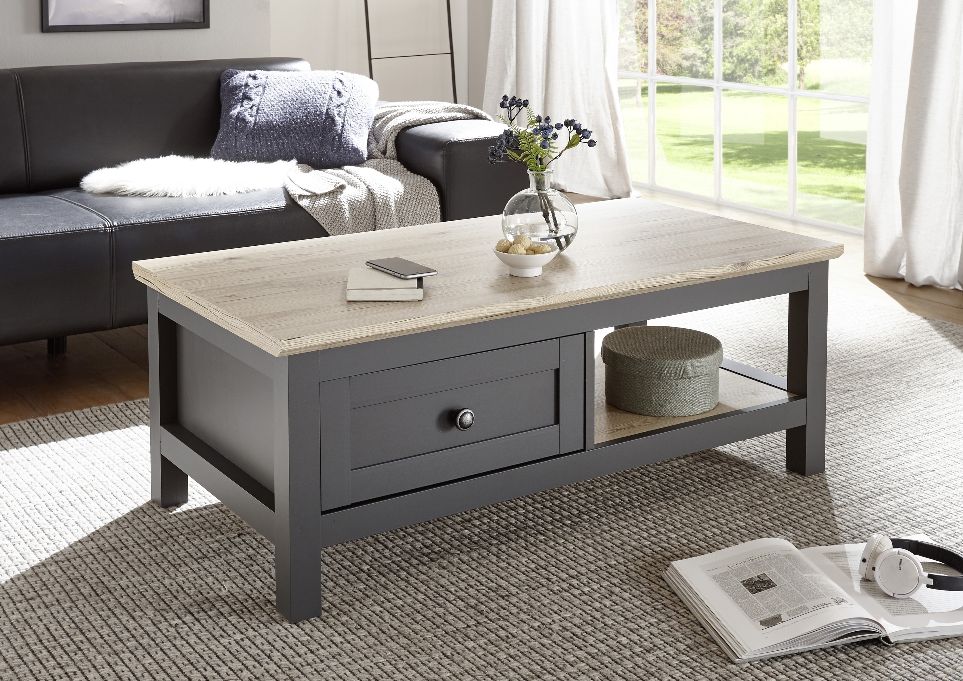 Eine Schublade und zwei Ablageflächen halten Zeitschriften, Fernbedienungen und Deko griffbereit.