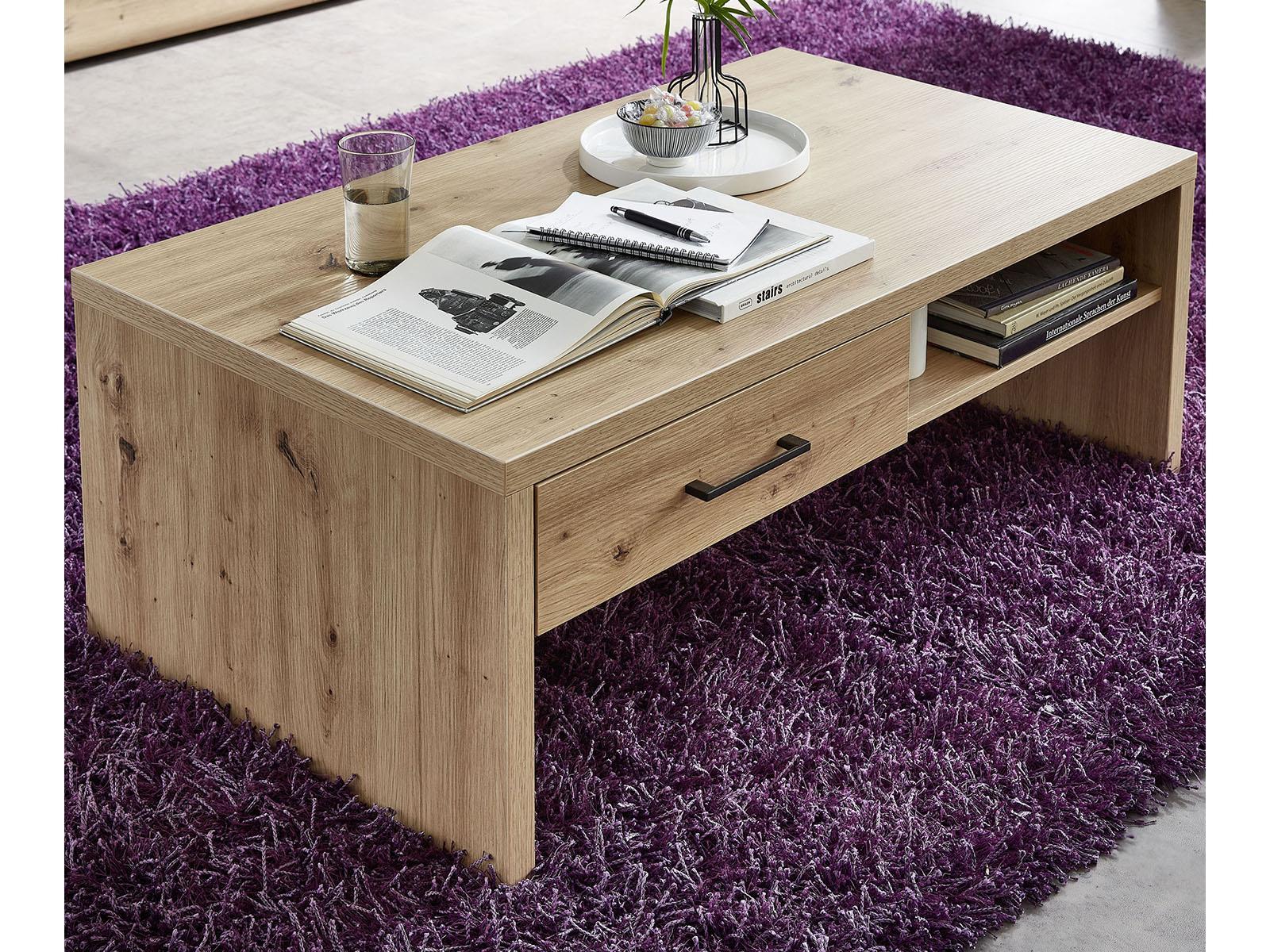 Optisch überzeugt "Filmer I" durch die elegante Artisan Eiche Nachbildung, die dem Wohnzimmer eine warme Note verleiht. Die in Schwarz gehaltenen Metallgriffe bilden dazu einen markanten Kontrast und unterstreichen den modernen Charakter des Tisches. Mit seinen Maßen von 110 cm Breite, 40 cm Höhe und 65 cm Tiefe fügt er sich harmonisch vor das Sofa ein, ohne den Raum zu überladen.