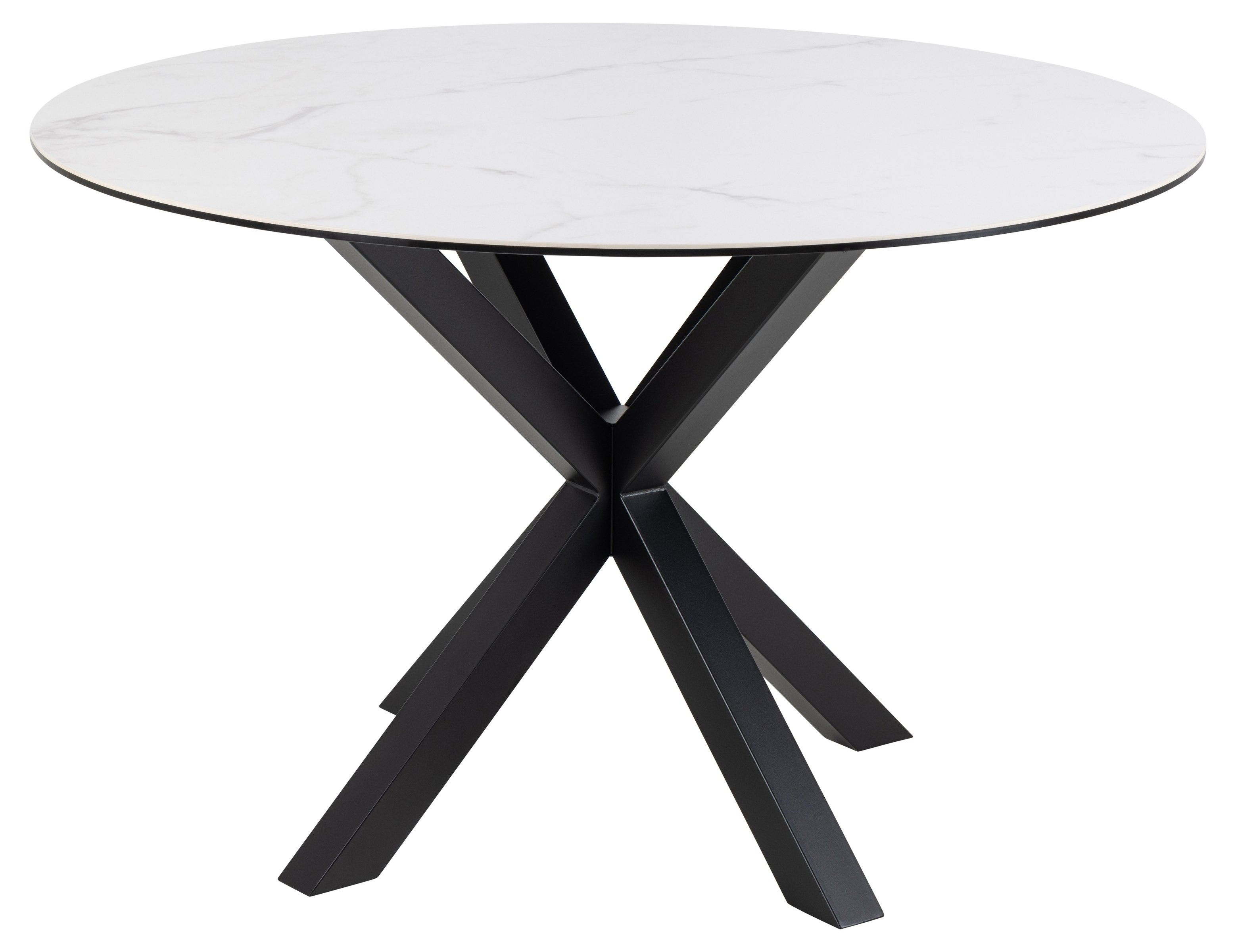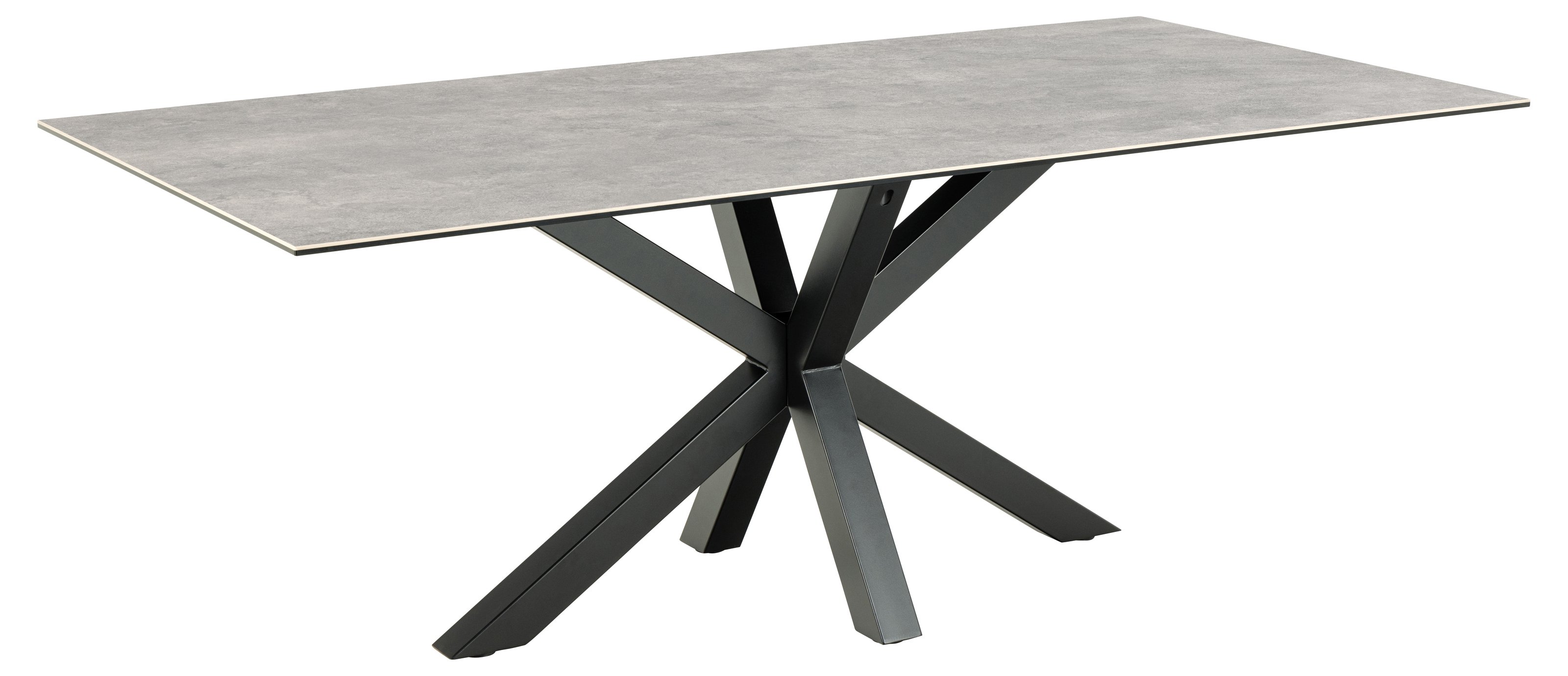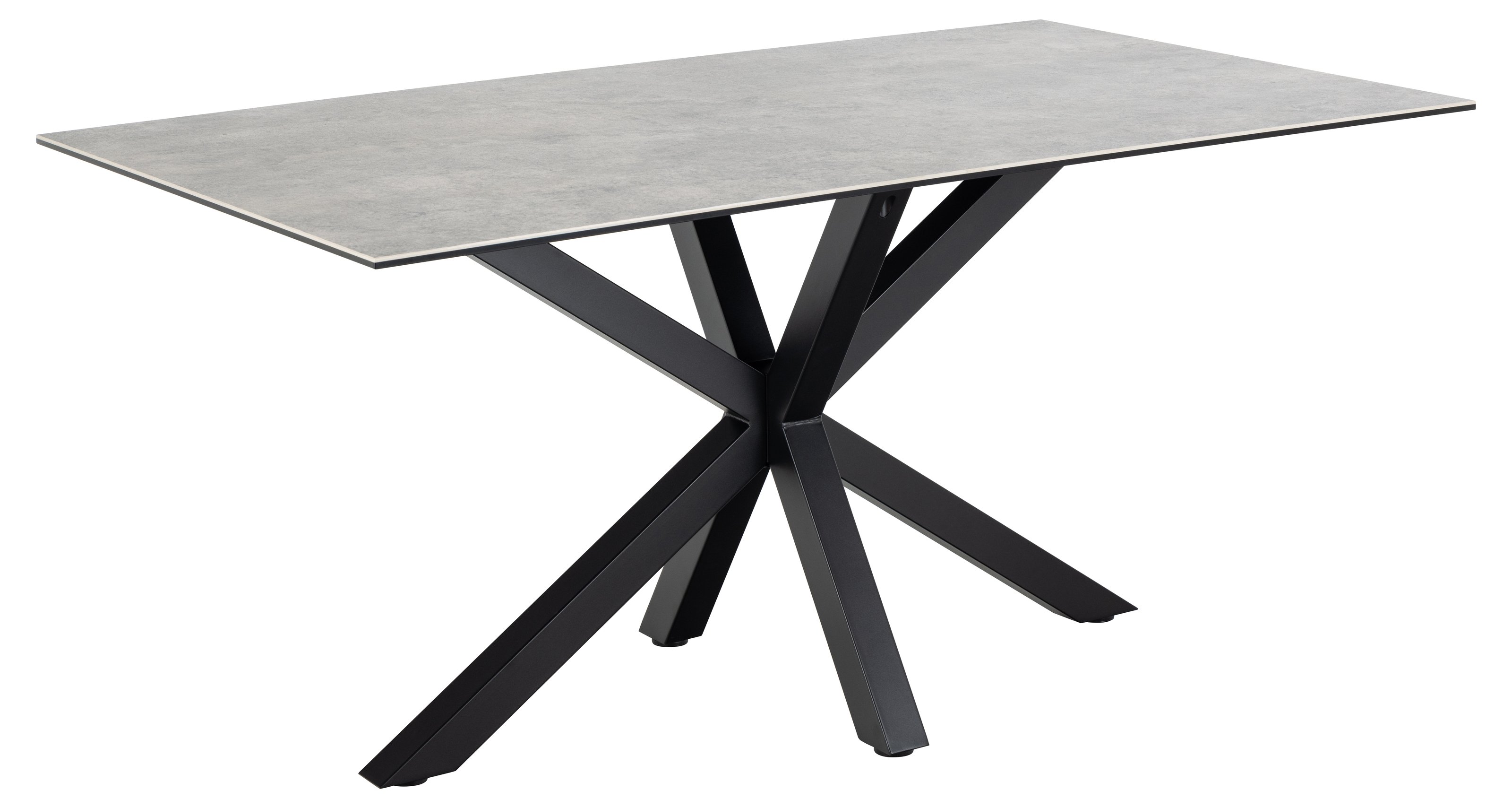 Das Gestell aus pulverbeschichtetem Stahl in mattem Schwarz mit kreuzförmigen Füßen sorgt für eine moderne Optik und garantiert gleichzeitig hohe Stabilität. Die raue Oberflächenbearbeitung verleiht dem Tisch eine angenehme Haptik und macht ihn besonders strapazierfähig.
