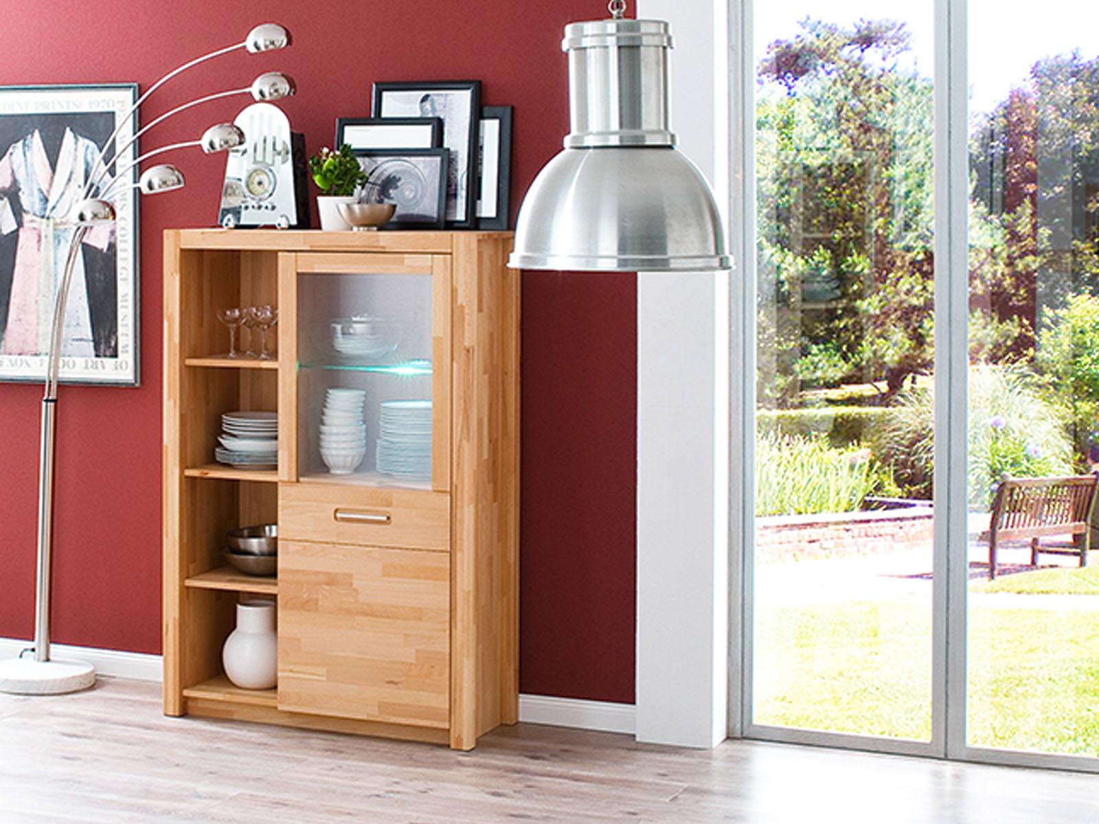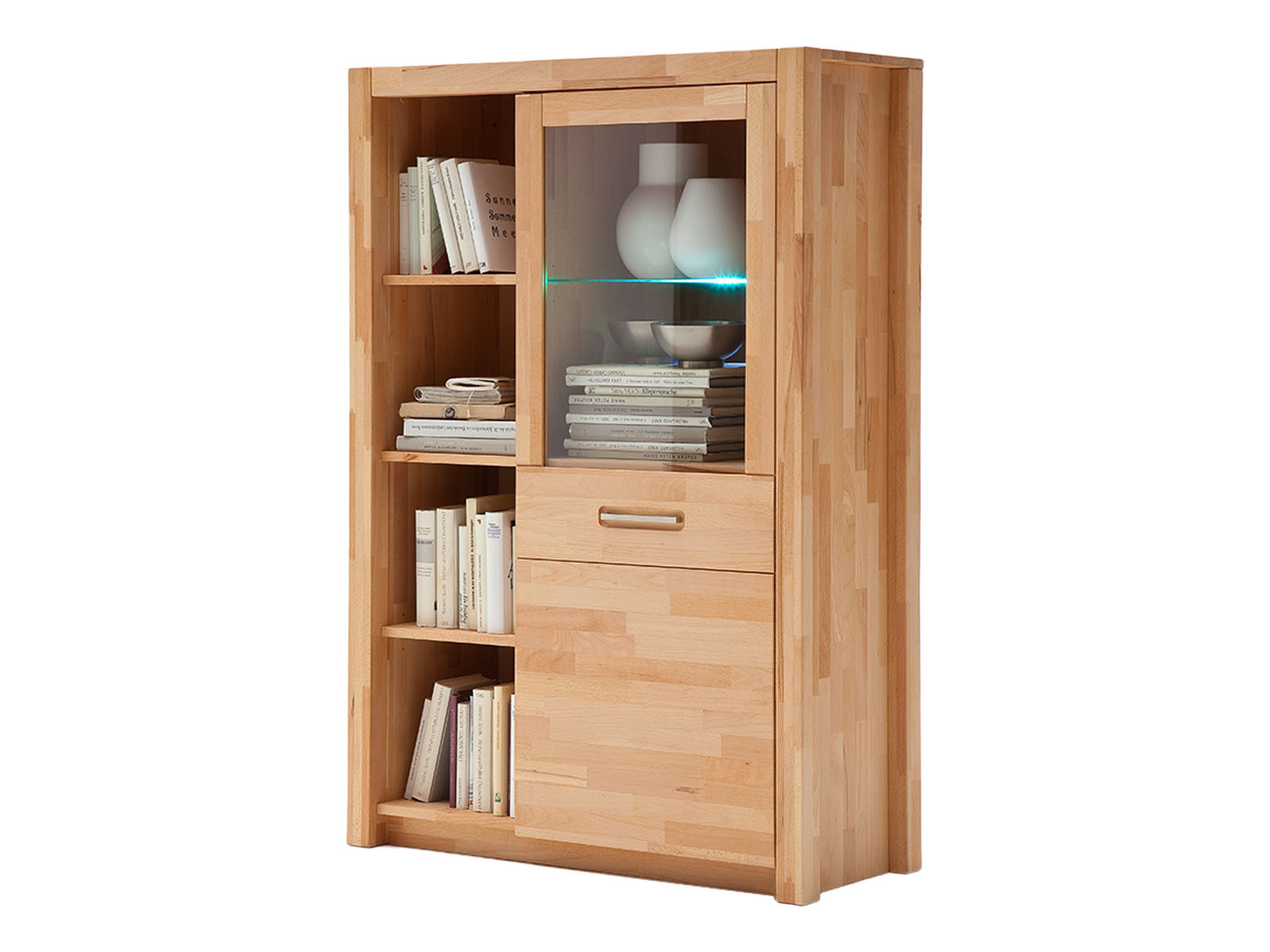 [BulletPoints] => Zeitlose Wohnwand;bestehend aus 1x Vitrine, 1x Wandboard, 1x TV-Lowboard und 1x Highboard (Rechtsanschlag);Front/Korpus-innen und außen in Kernbuche keilverzinkt Massiv geölt;Rahmentür in Kernbuche keilverzinkt Massiv geölt mit Klarglas, Metallgriffe, Schubkastenführung, inkl. Beleuchtung;Breite 309 cm, Höhe 203 cm, Tiefe 46 cm