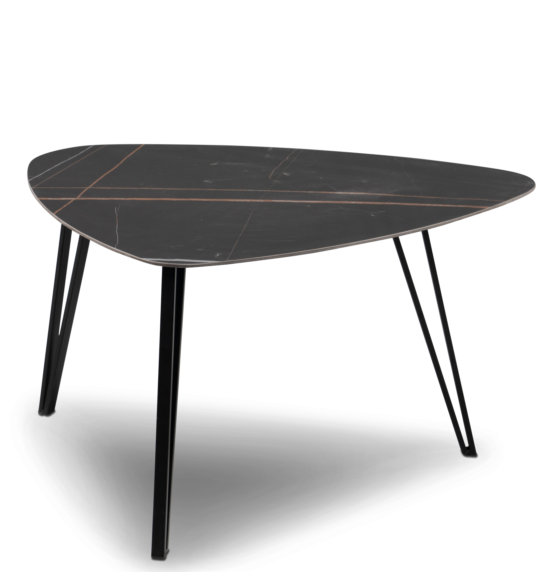 Das stabile Metallgestell in zeitlosem Schwarz und die Tischplatte aus dunkler Keramik machen Liv zu einem eleganten Blickfang. Dank der dreieckigen Form wirkt der Tisch besonders modern und lässt sich flexibel im Wohnraum positionieren.