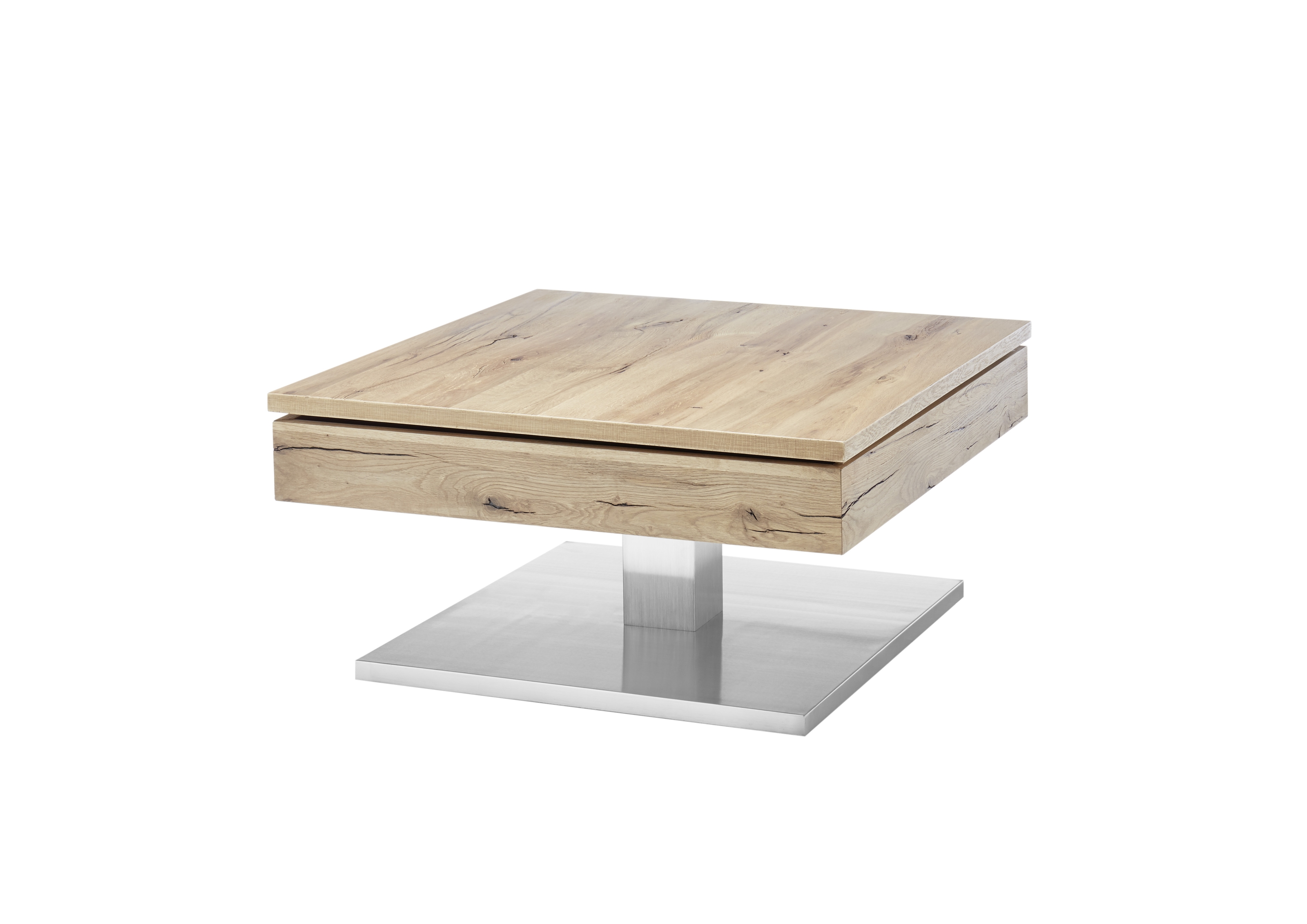 Die Tischplatte besteht aus einer geölten Asteiche furnierten Holzwerkstoffplatte mit Echtholzfurnier, deren natürliche Maserung und warmer Braunton für eine wohnliche Atmosphäre sorgen. Die geölte Oberfläche betont die Struktur des Holzes und lässt sich zugleich leicht pflegen. Das Gestell und die Sockelplatte in gebürsteter Edelstahloptik ergänzen den warmen Holzton durch eine kühle, moderne Note und verleihen dem Couchtisch eine robuste, stilvolle Basis.