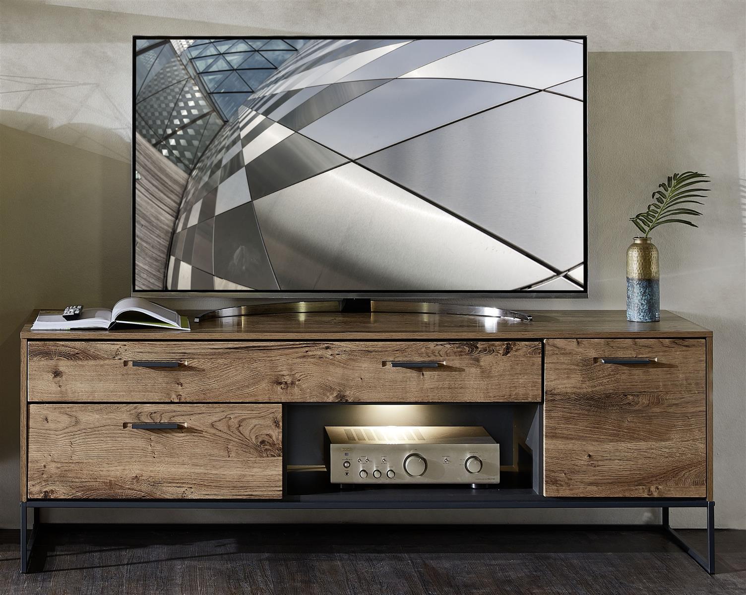 Ein Schubkasten mit Selbsteinzug und Softclose-Funktion sorgt dafür, dass Sie Kleinteile leise und komfortabel verstauen können, während zwei offene Fächer schnellen Zugriff auf alles bieten, was Sie im Wohnbereich griffbereit haben möchten.