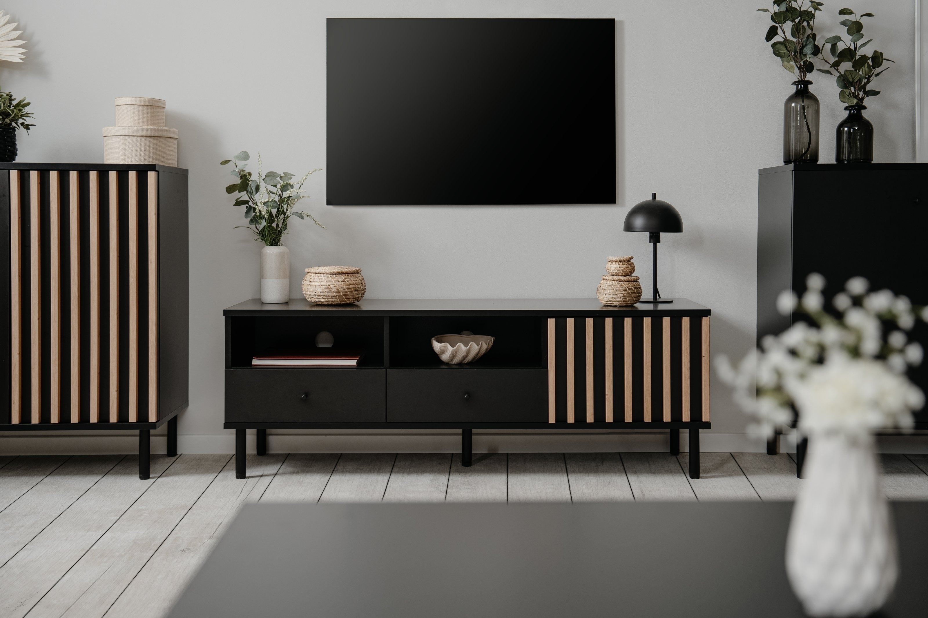 Die elegante Kombination aus Schwarz und Dekor Artisan Eiche sowie die aufgesetzten Lamellen in 3D-Holzoptik verleihen dem Tisch eine besondere Tiefe und Struktur. Zwei Türen und zwei offene Fächer mit Innenmaßen von 60,9 x 13,4 x 67 cm schaffen praktischen Stauraum für Bücher, Zeitschriften und Alltagsgegenstände, die schnell griffbereit, aber ordentlich verstaut sein sollen.