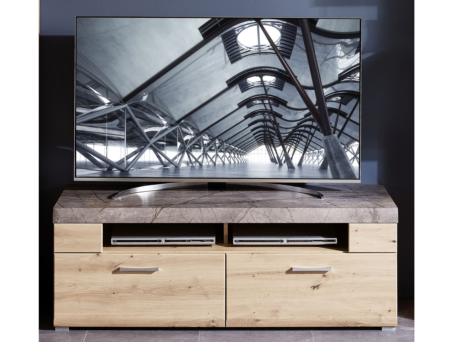 Ein besonderes Highlight ist der geteilte Ablageboden, auf dem Fernbedienungen, TV-Zeitungen oder kleine Accessoires ordentlich verstaut werden können, wenn die Fläche auf der Tischplatte anderweitig benötigt wird. So bleibt Ihr Wohnzimmer aufgeräumt, ohne dass Sie auf Komfort verzichten müssen.