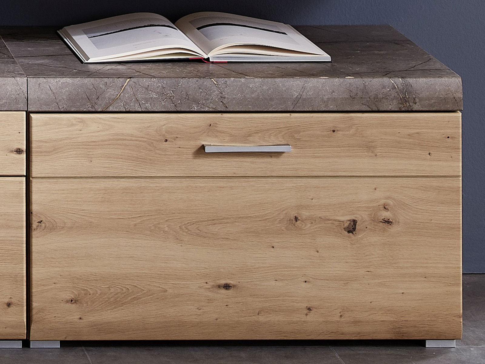 [Bullet-Point 3] => Der Schreibtisch "Thasos II" ist in edlem Grau gehalten, welches stilvoll mit vornehmer Artisan Eiche kombiniert wird. Dank dieser Farbgebung lässt er sich nahezu überall in bereits bestehende Interieure problemlos integrieren. Die Holznachbildung ist qualitativ sehr hochwertig mit täuschend echter Maserung.