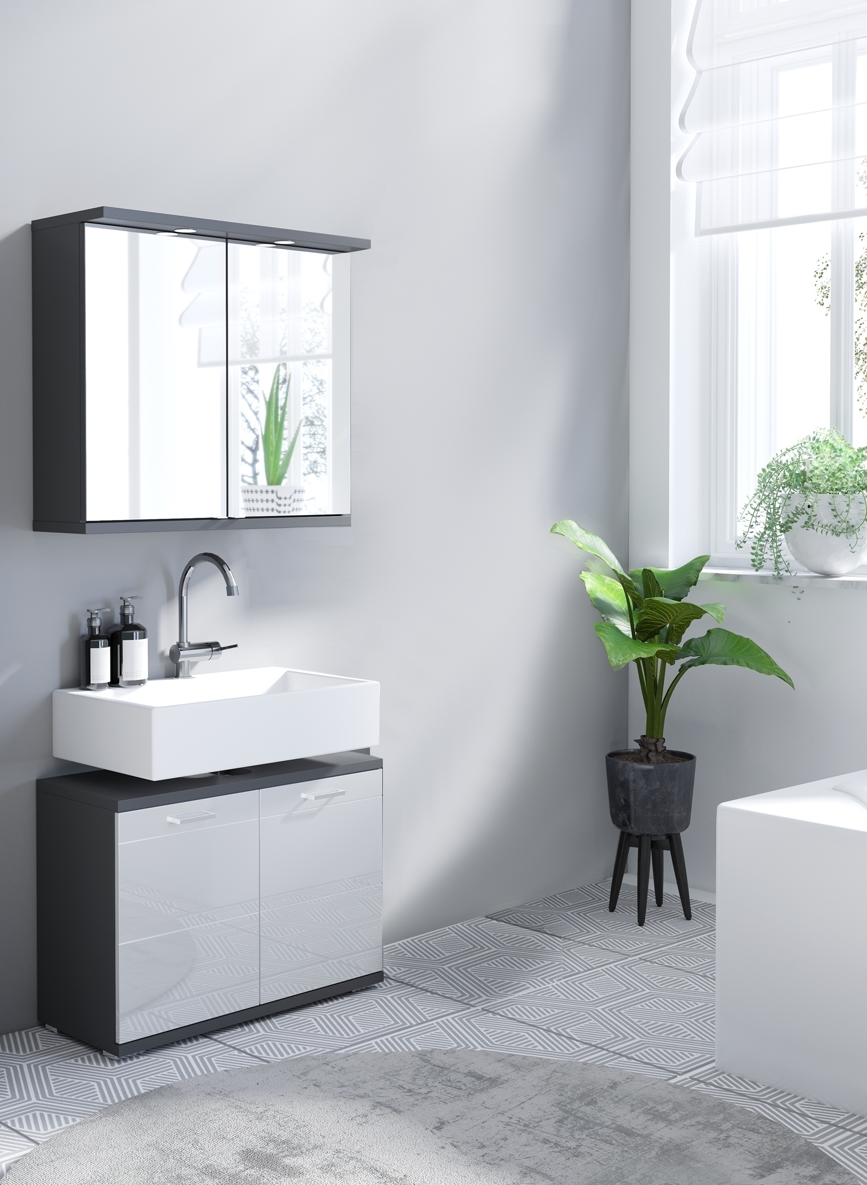 Im Inneren überzeugen die individuell einstellbaren Einlegeböden, die dir flexible Aufbewahrungsmöglichkeiten bieten. So kannst du die Fächer auf deine persönlichen Bedürfnisse anpassen und sowohl kleine Pflegeprodukte als auch höheres Flaschen- oder Elektrogerät komfortabel unterbringen. Zwei offene Fächer setzen zudem häufig genutzte Utensilien oder dekorative Elemente ansprechend in Szene.