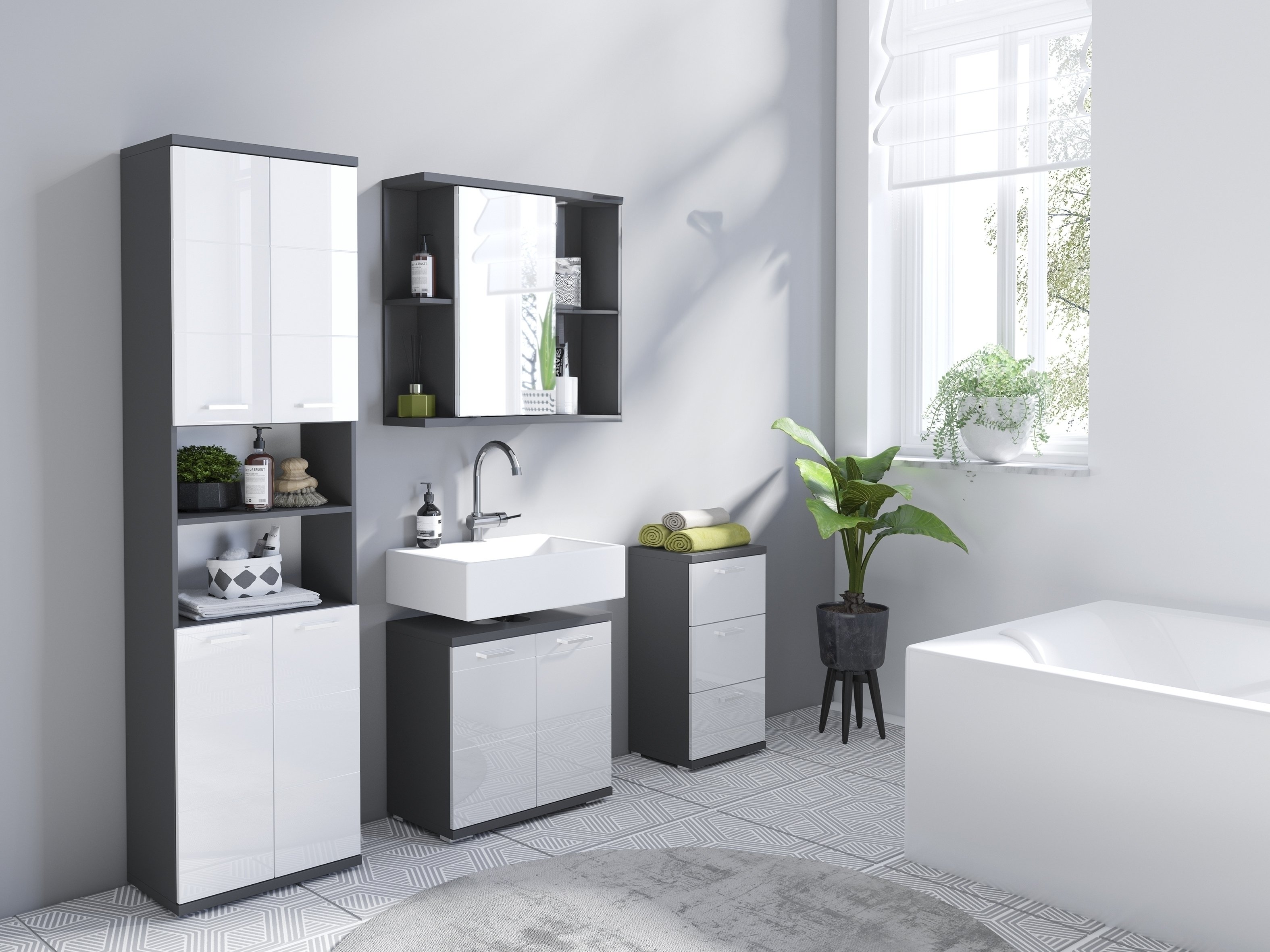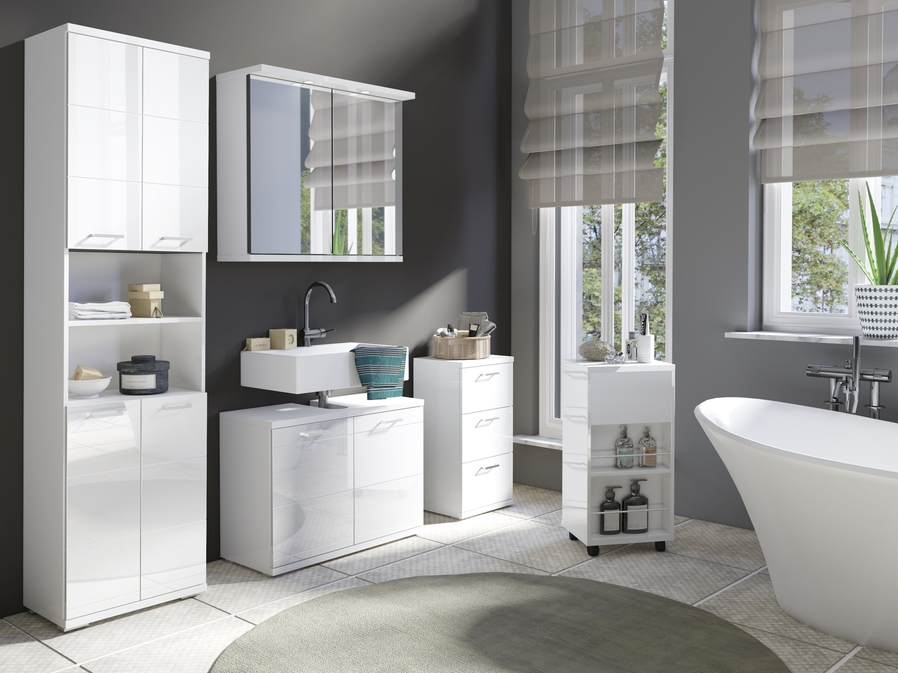 Die edle Hochglanzfront in Weiß in Kombination mit verchromten Metallgriffen verleiht dem Badezimmerschrank ein modernes, cleanes Finish. Dank individuell einstellbarer Einlegeböden kannst du den Innenraum flexibel an deine Bedürfnisse anpassen – vom kleinen Kosmetikartikel bis zur hohen Flasche findet alles seinen Platz.