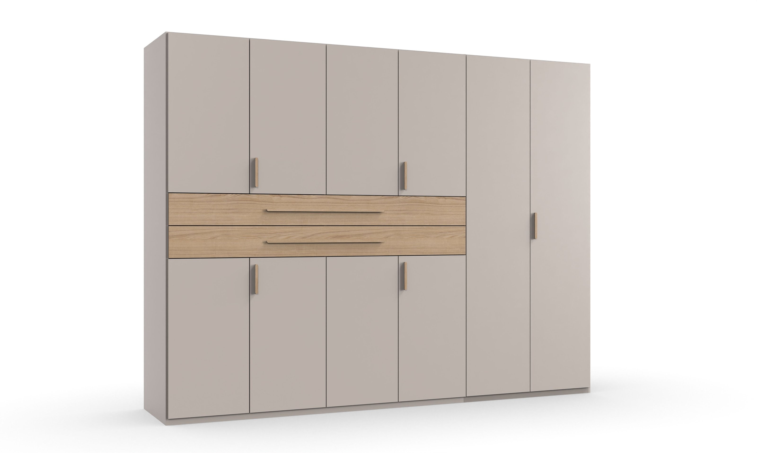 [BulletPoints] => Maße: 270/208/58 cm (B/H/T) bieten großzügigen Stauraum für Kleidung, Bettwäsche und Accessoires, ideal für moderne Schlafzimmer.;Hochwertiges Material: DIGIT besteht aus stabiler Spanplatte in Kaschmir mit Griffen aus Dorena Eiche NB, langlebig, pflegeleicht und robust.;Flexibles Stauraumkonzept: Vier Einlegeböden 87 cm sowie zwei Schubladen ermöglichen individuelle Organisation und Übersicht für Kleidung.;Modernes Design: Stilvolles Kaschmir kombiniert mit Griffen aus Dorena Eiche NB verleiht DIGIT einen eleganten, zeitgemäßen Look.;Lieferzustand: DIGIT wird zerlegt in sechs Paketen geliefert, inklusive Aufbauanleitung, für unkomplizierten Transport und einfache Montage.