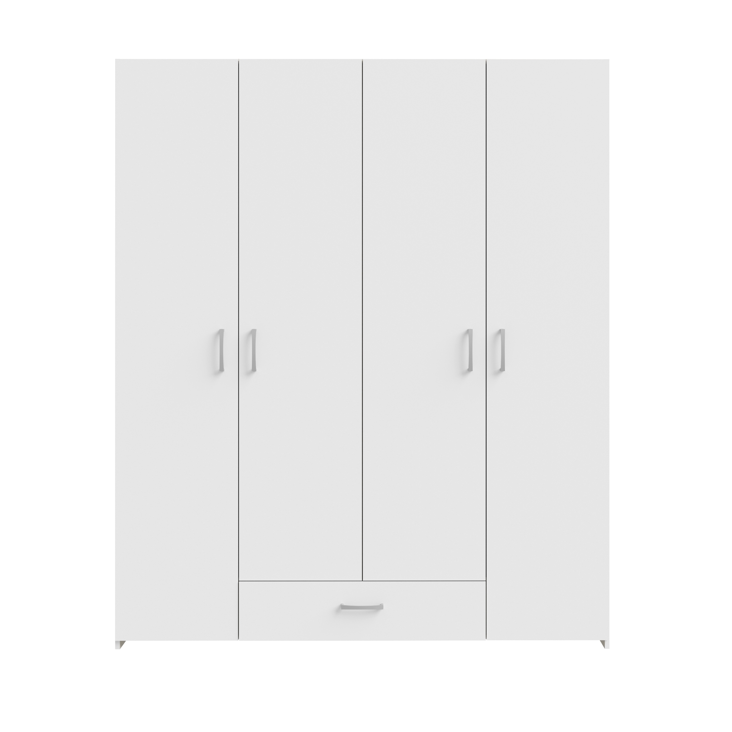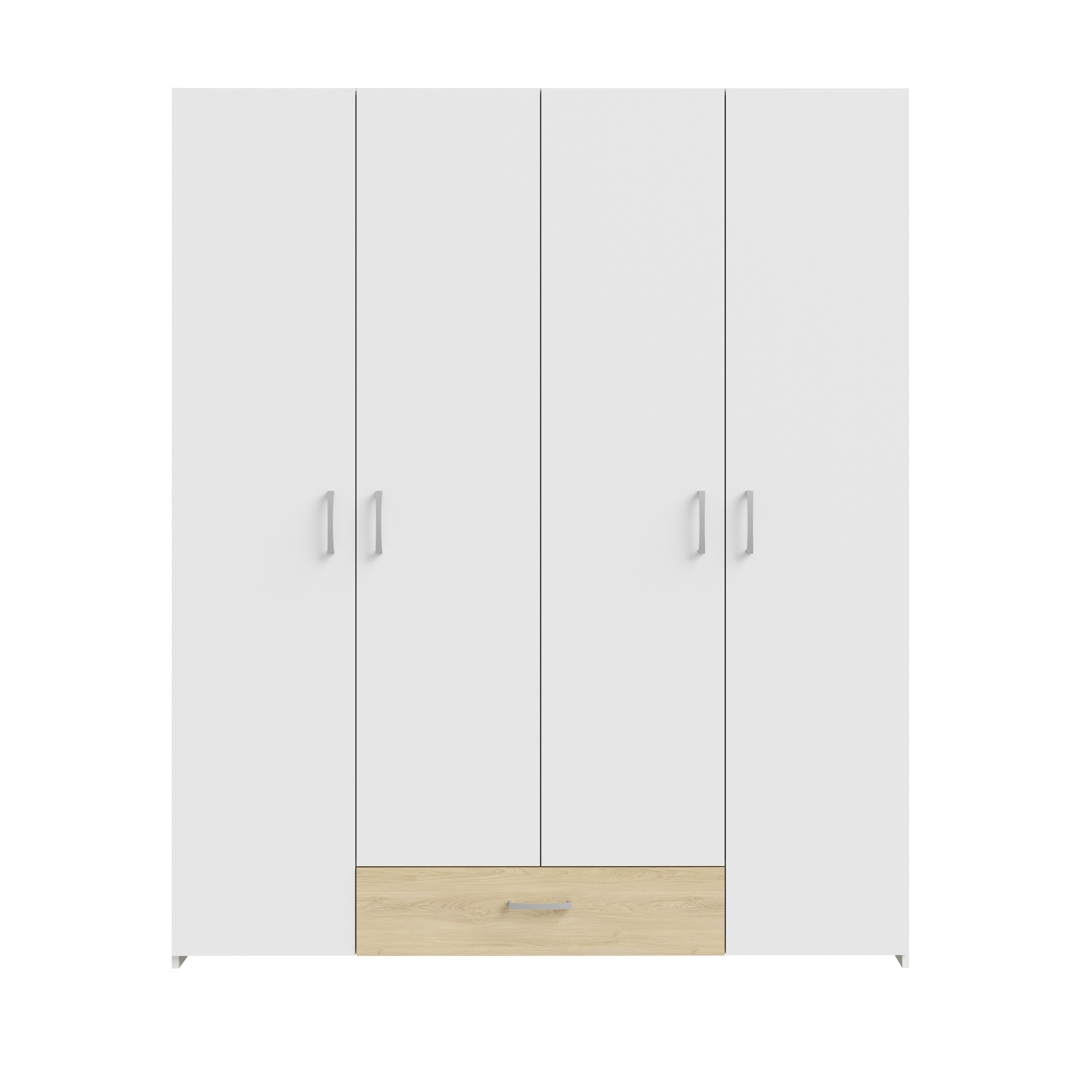 Im Inneren sorgen zwei Kleiderstangen, zwei Einlegeböden, zwei Ablageböden und eine geräumige Schublade für eine übersichtliche Organisation Ihrer Kleidung und Accessoires. Die vier Drehtüren lassen sich bequem öffnen und ermöglichen Ihnen einen schnellen, komfortablen Zugriff auf den gesamten Schrankinhalt im Alltag.