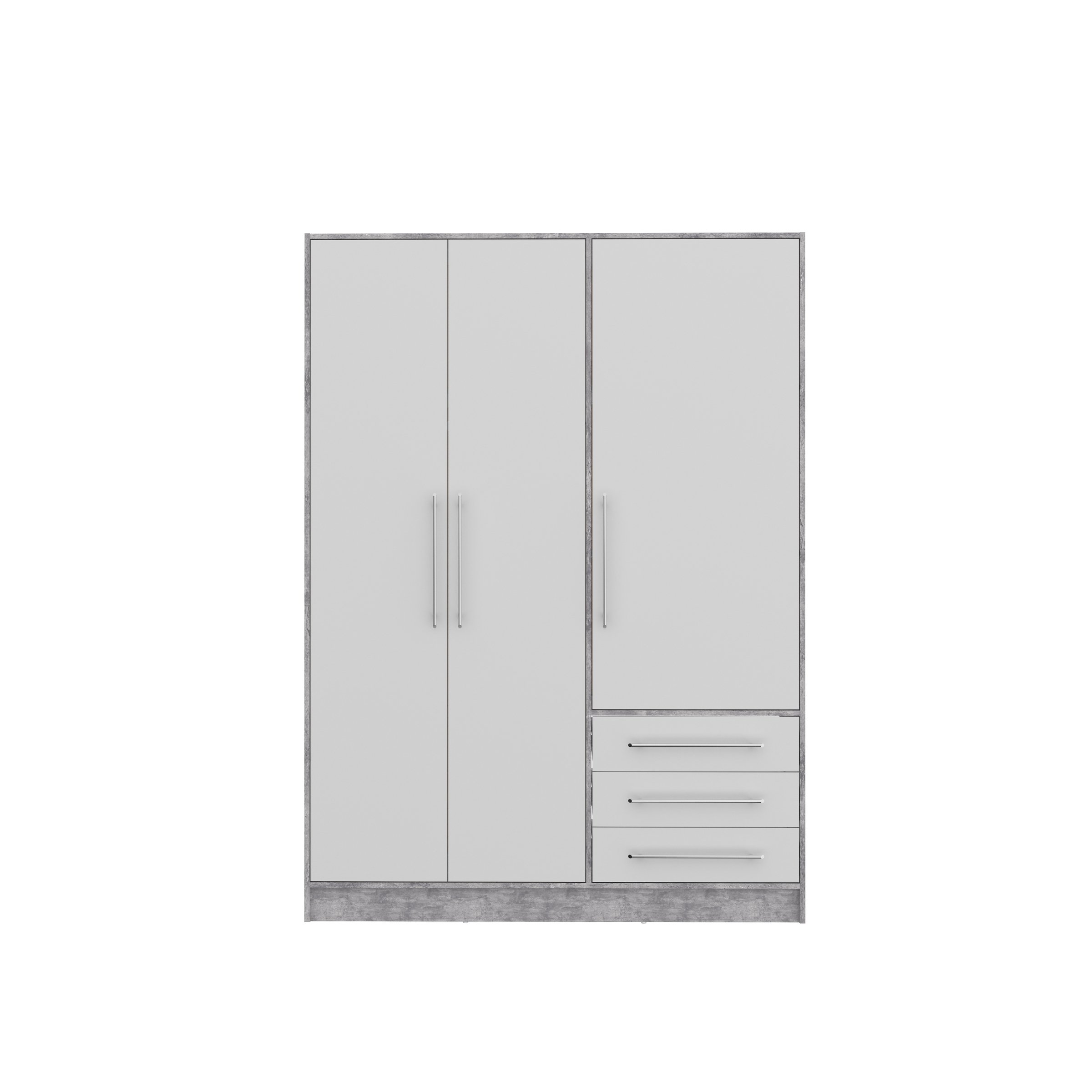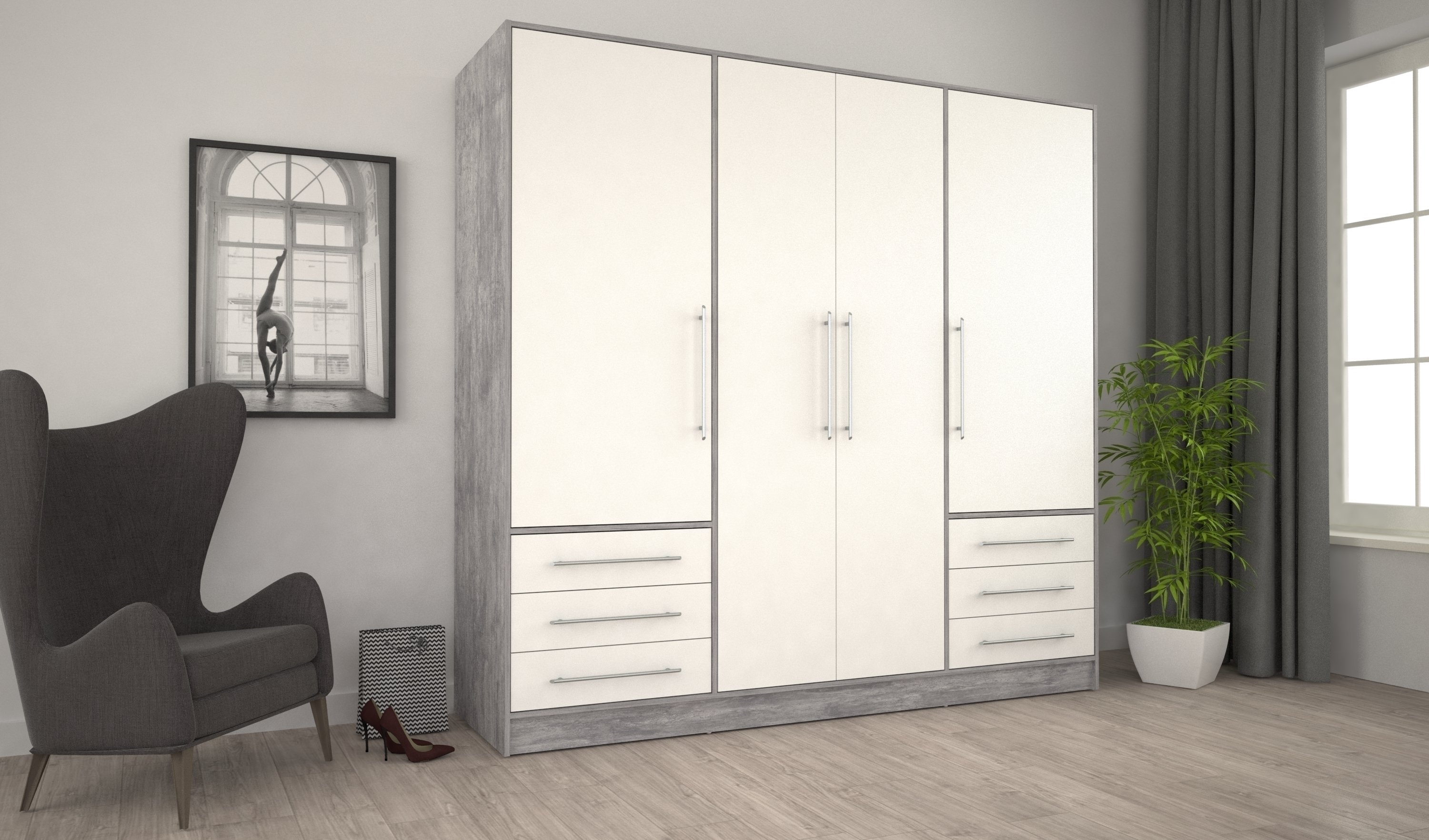 [BulletPoints] => Der Kleiderschrank bietet mit 206,5 cm Breite, 200 cm Höhe und 60 cm Tiefe viel Stauraum für Ihre Kleidung und Accessoires in Betonoptik Lichtgrau und Weiß.;Aus 15 mm starker Spanplatte gefertigt, garantiert die Front des Schranks Langlebigkeit und Stabilität. Die Kanten sind mit Papierkante versehen, um Abnutzung zu minimieren.;Der überzeugt mit eleganten Aluminium-Kantengriffen und schwarzen Kunststofffüßen. Die Beschichtung in Folie PP verleiht der Betonoptik einen stilvollen Finish.;Mit 6 Schubladen, 4 Türen und 7 Innenfächern bietet der Schrank vielseitige Aufbewahrungsmöglichkeiten. Eine Kleiderstange sorgt für zusätzlichen Platz für hängende Kleidung.;Der Kleiderschrank wird zerlegt geliefert, was eine einfache und flexible Montage ermöglicht. Alle Teile sind gut verpackt und für eine schnelle Zusammenstellung vorbereitet.