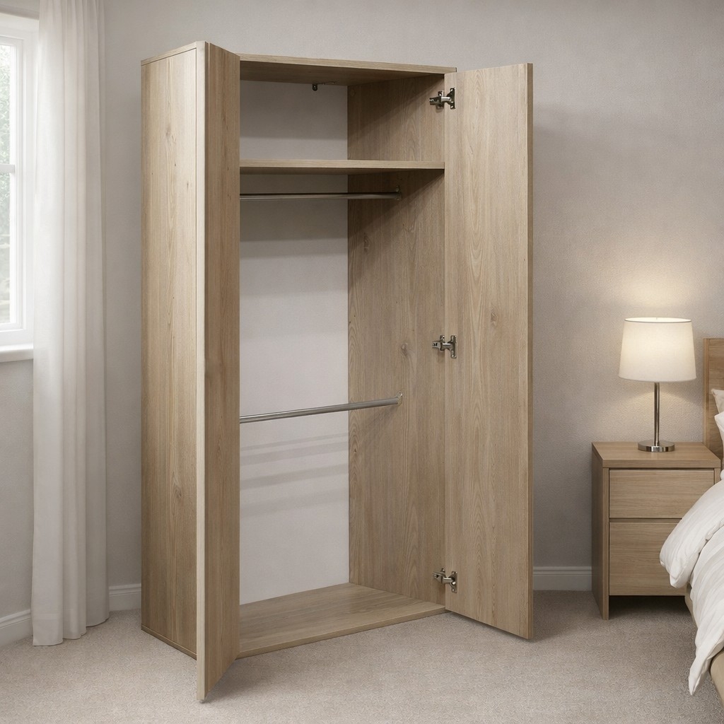 Im Inneren überzeugt Merida mit einer durchdachten Aufteilung: Zwei Kleiderstangen bieten Platz für Jacken, Hemden oder Kinderkleidung, während ein stabiler Einlegeboden zusätzlichen Stauraum schafft. So behalten Sie den Überblick und nutzen den vorhandenen Raum optimal, egal ob für Kleidung, Haushaltsutensilien oder Saisontextilien.