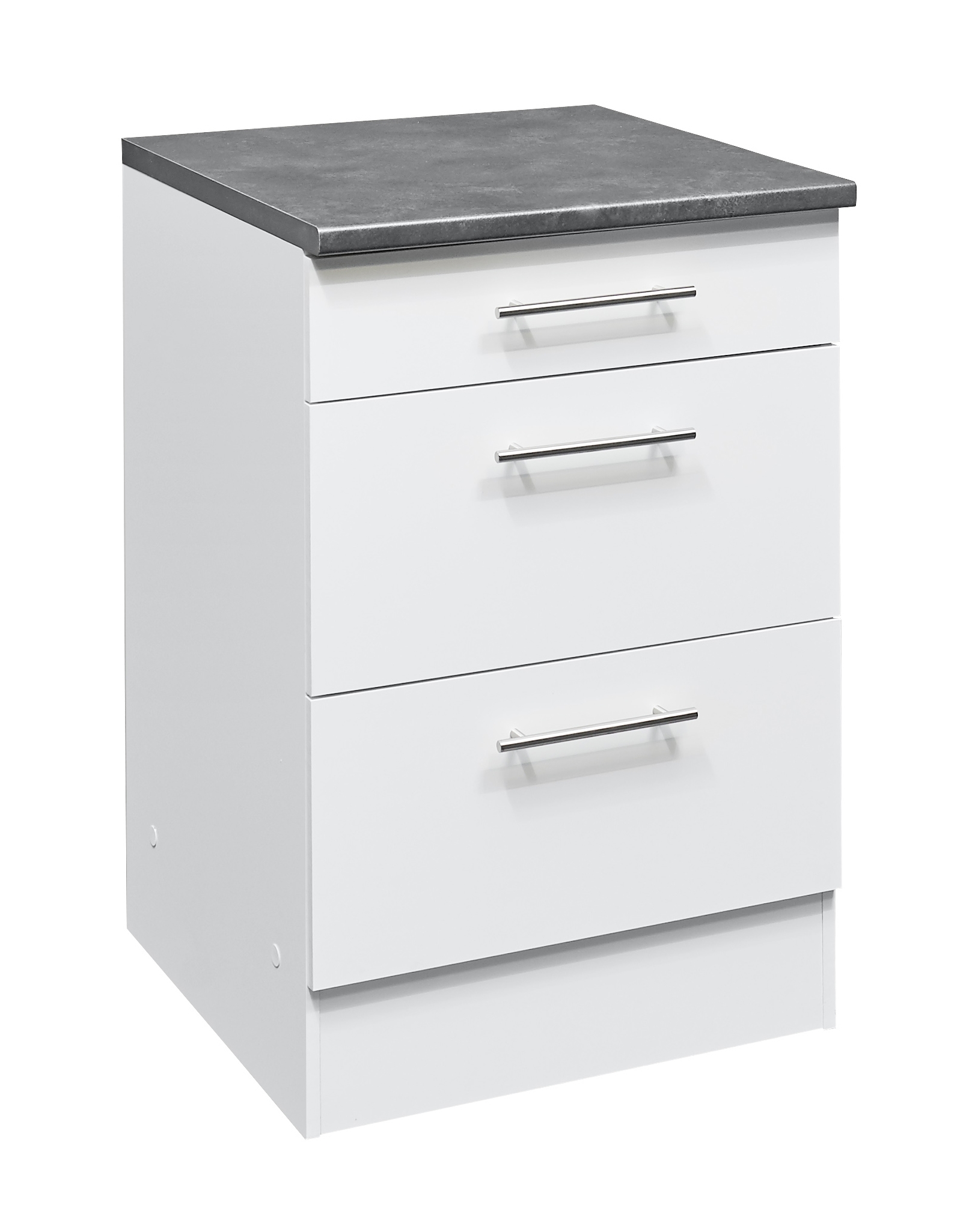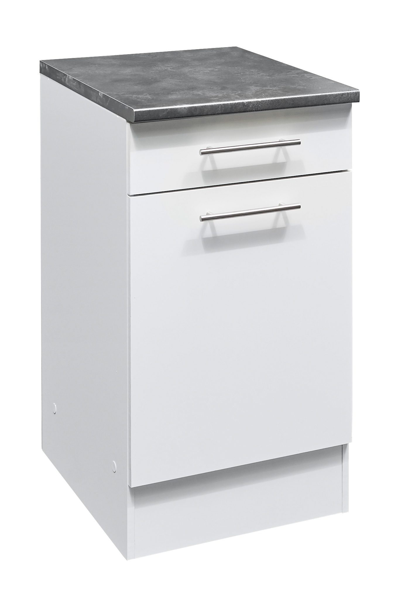 Die kontrastierende Arbeitsplatte in Stone Dark Dekor setzt einen modernen Akzent zum weißen Design und unterstreicht den aktuellen Look. Hinter der Tür stehen zwei großzügige Fächer zur Verfügung, während die Schublade – ausgestattet mit einem Unterflurauszug und Softclose-Mechanismus – sich ideal für Besteck und kleinere Küchenhelfer eignet und besonders leises, komfortables Schließen ermöglicht.