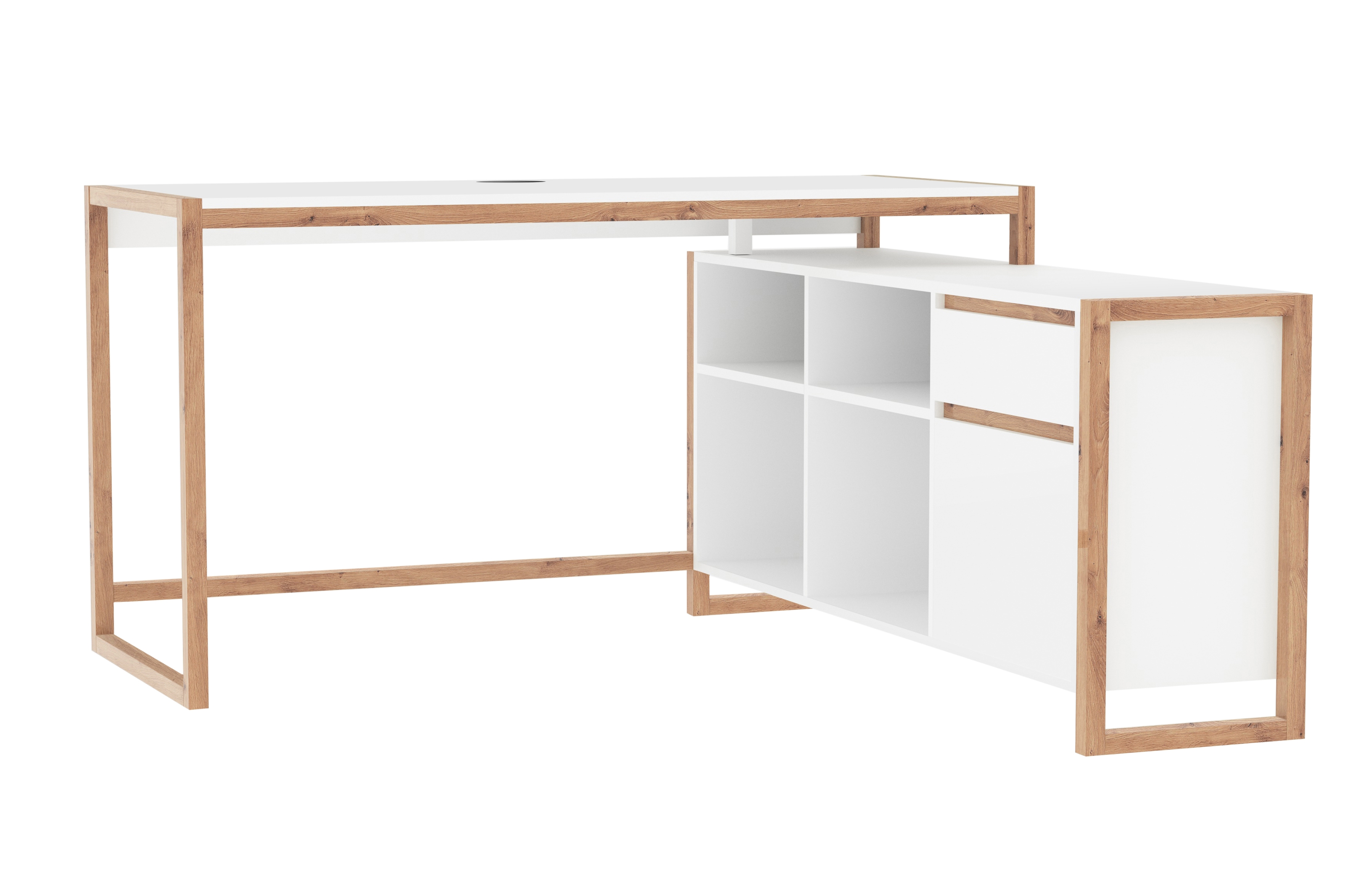 Der Stauraum des Schreibtischs ist durchdacht organisiert: Ein Schubfach, eine Drehtür und vier offene Fächer ermöglichen eine übersichtliche Aufbewahrung von Dokumenten, Büromaterial oder technischen Geräten. Die flexible Montagemöglichkeit der Ecke – wahlweise links oder rechts – macht den Schreibtisch zu einer vielseitigen Lösung für unterschiedliche Raumlayouts. Der integrierte Kabeldurchlass in der Tischplatte sorgt zudem für eine saubere Kabelorganisation.