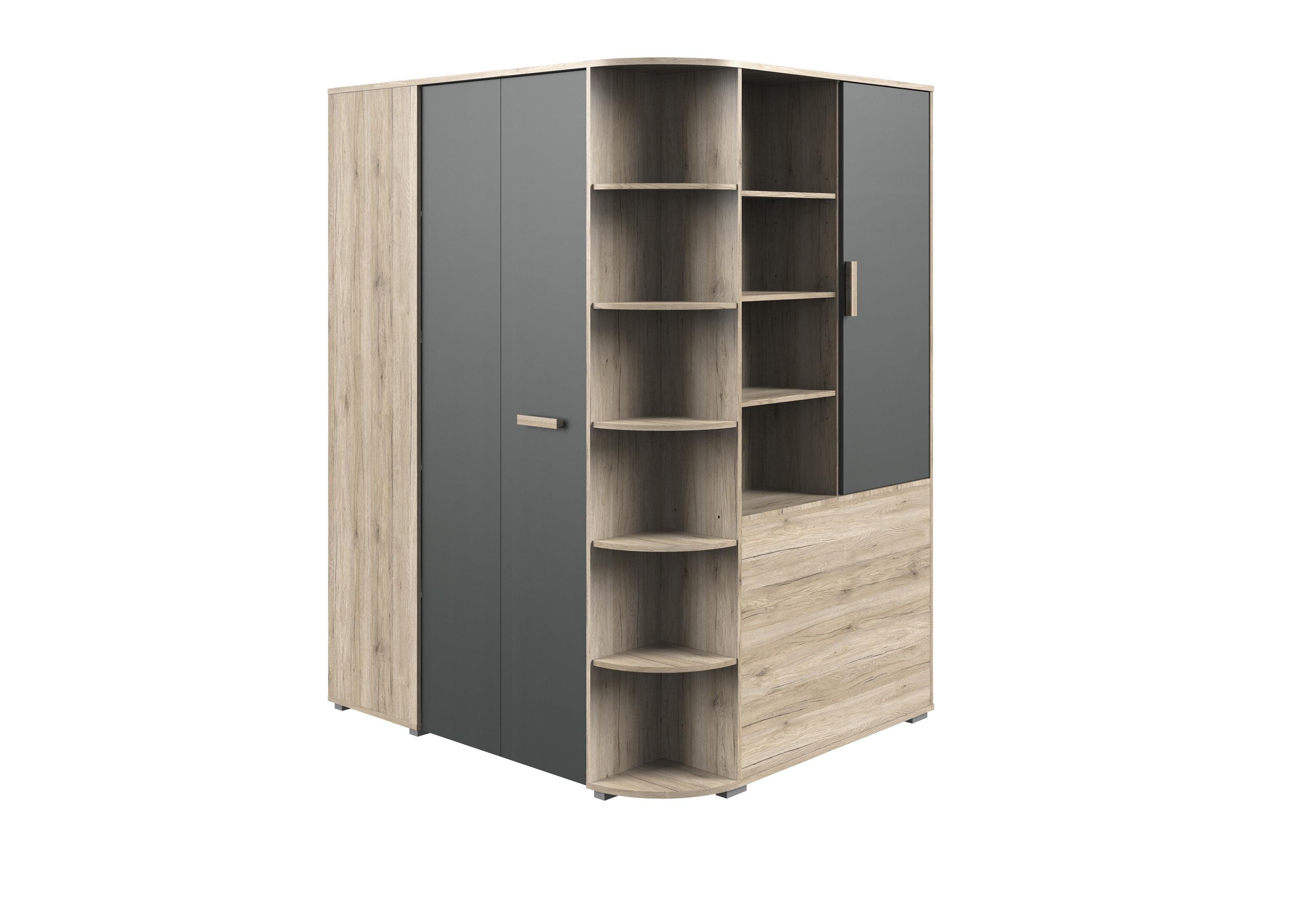 [metaDescription] => Moderner begehbarer Eck-Kleiderschrank aus Spanplatte in San Remo Eiche Nachbildung, Absetzungen in Graphit mit 2 Holztüren, 16 Einlegeböden und 1 Kleiderst