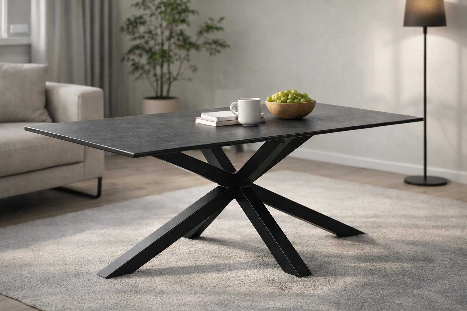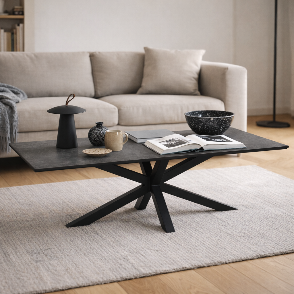 [Bullet-Point 3] => Das robuste Gestell aus matt schwarz pulverbeschichtetem Stahl sorgt für Stabilität und Langlebigkeit, und die Kreuzform der Beine bietet eine moderne Optik.