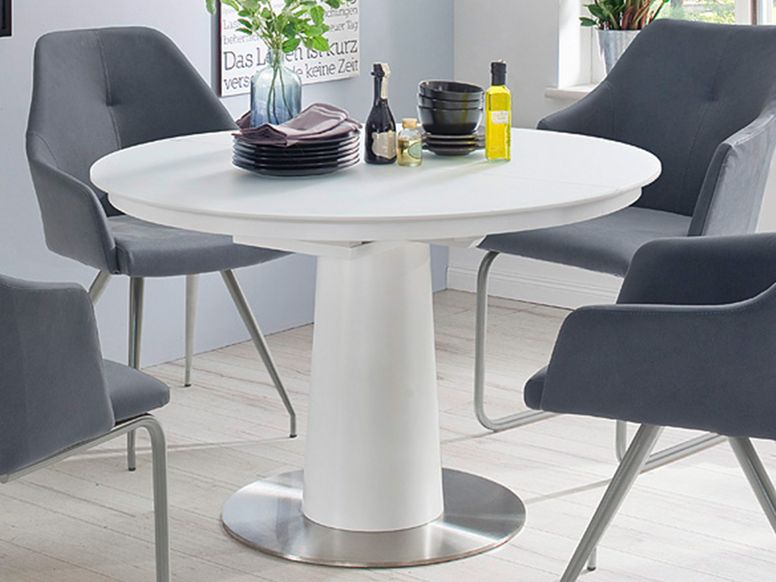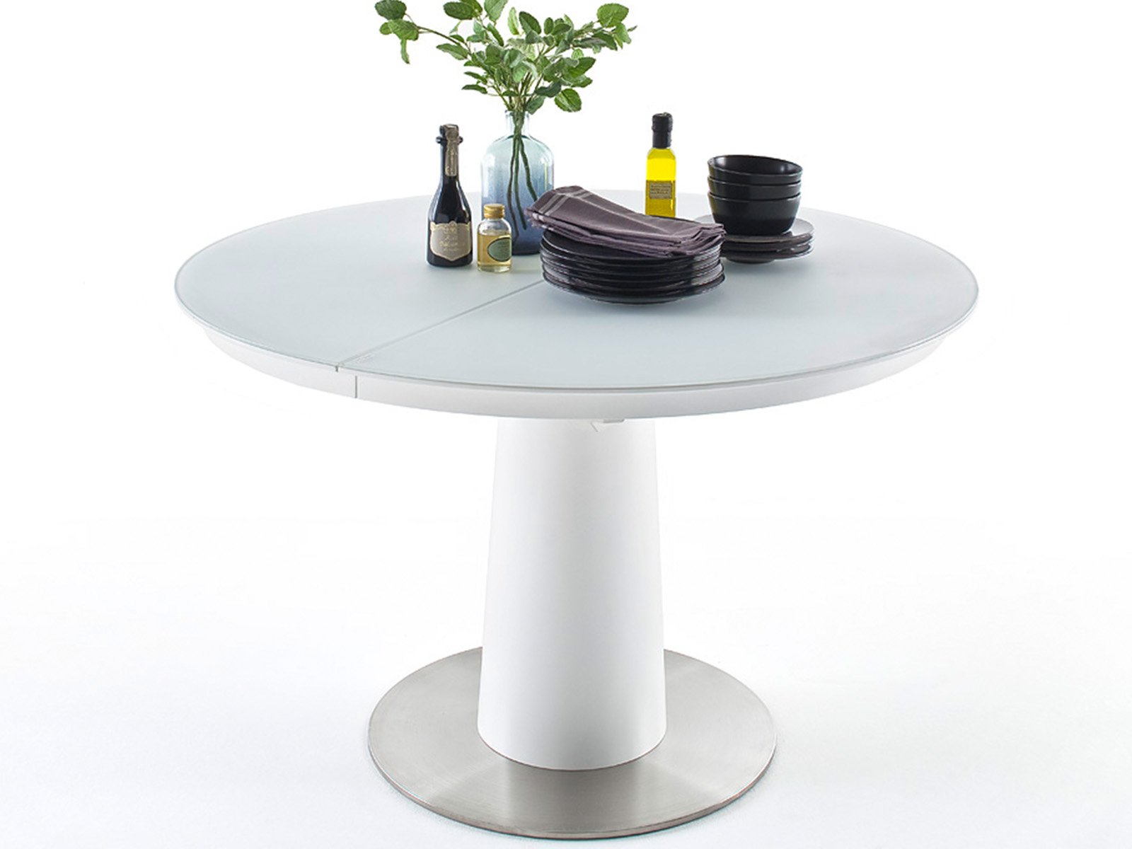 [metaDescription] => Moderner Esszimmertisch aus MDF in Weiß-Matt lackiert mit Sicherheitsglas matt reinweiß lackiert, Bodenplatte in Edelstahl gebürstet Breite Ø 120 (160) cm,