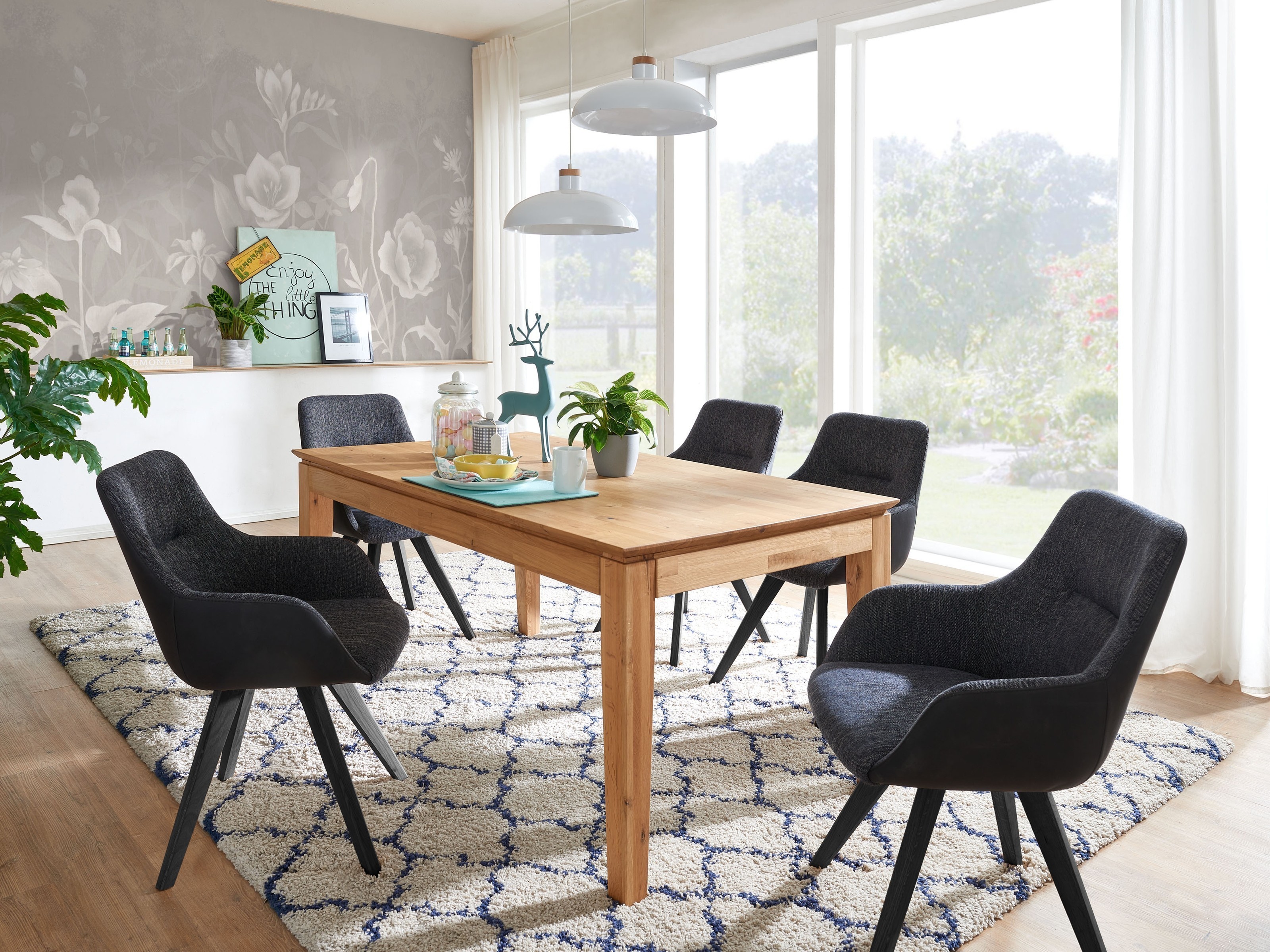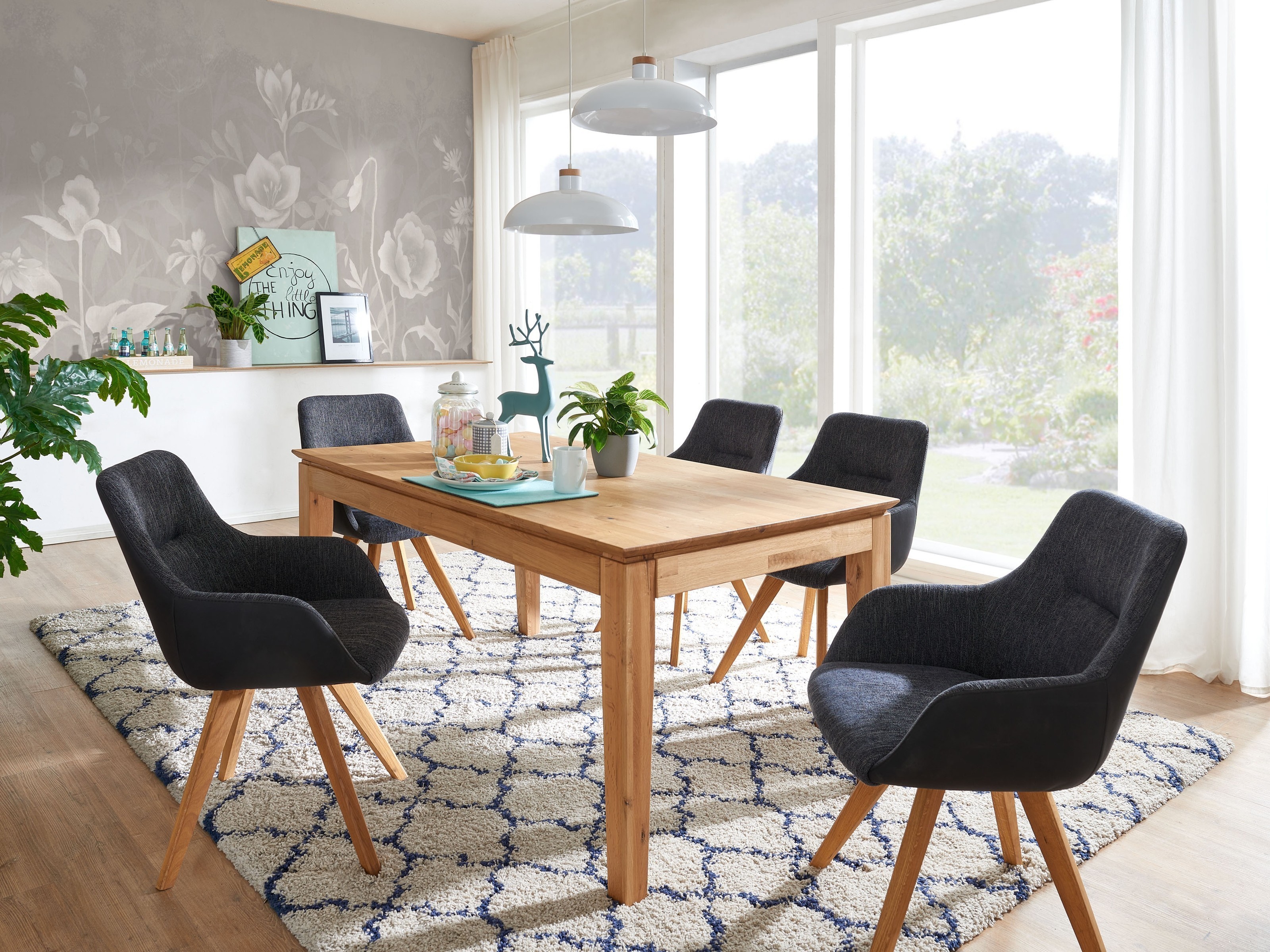 Die massive Wildeiche in natur geölt sorgt für einen robusten und zugleich wohnlich-warmen Mittelpunkt in Ihrem Essbereich.